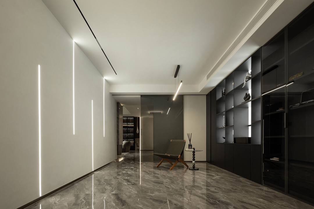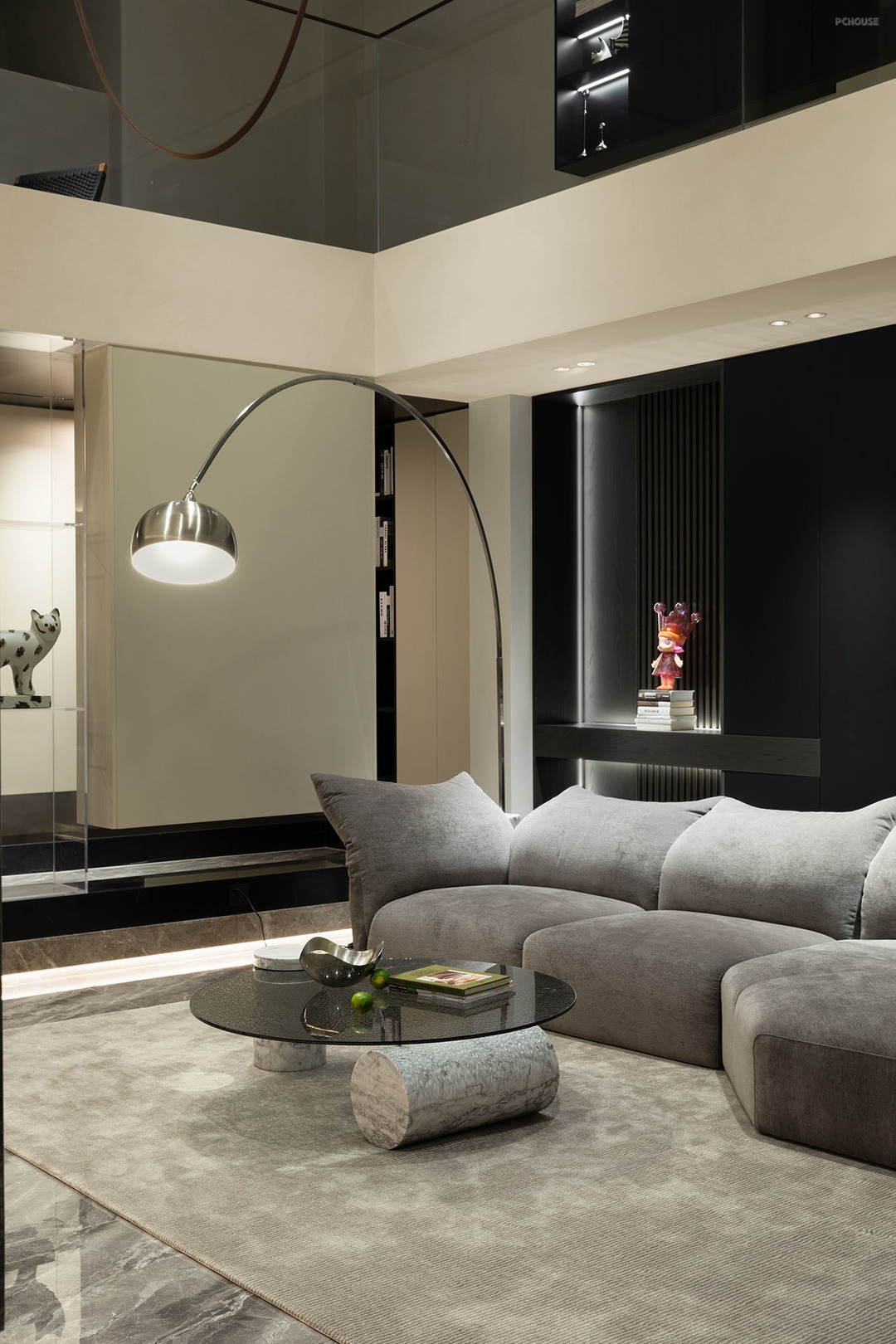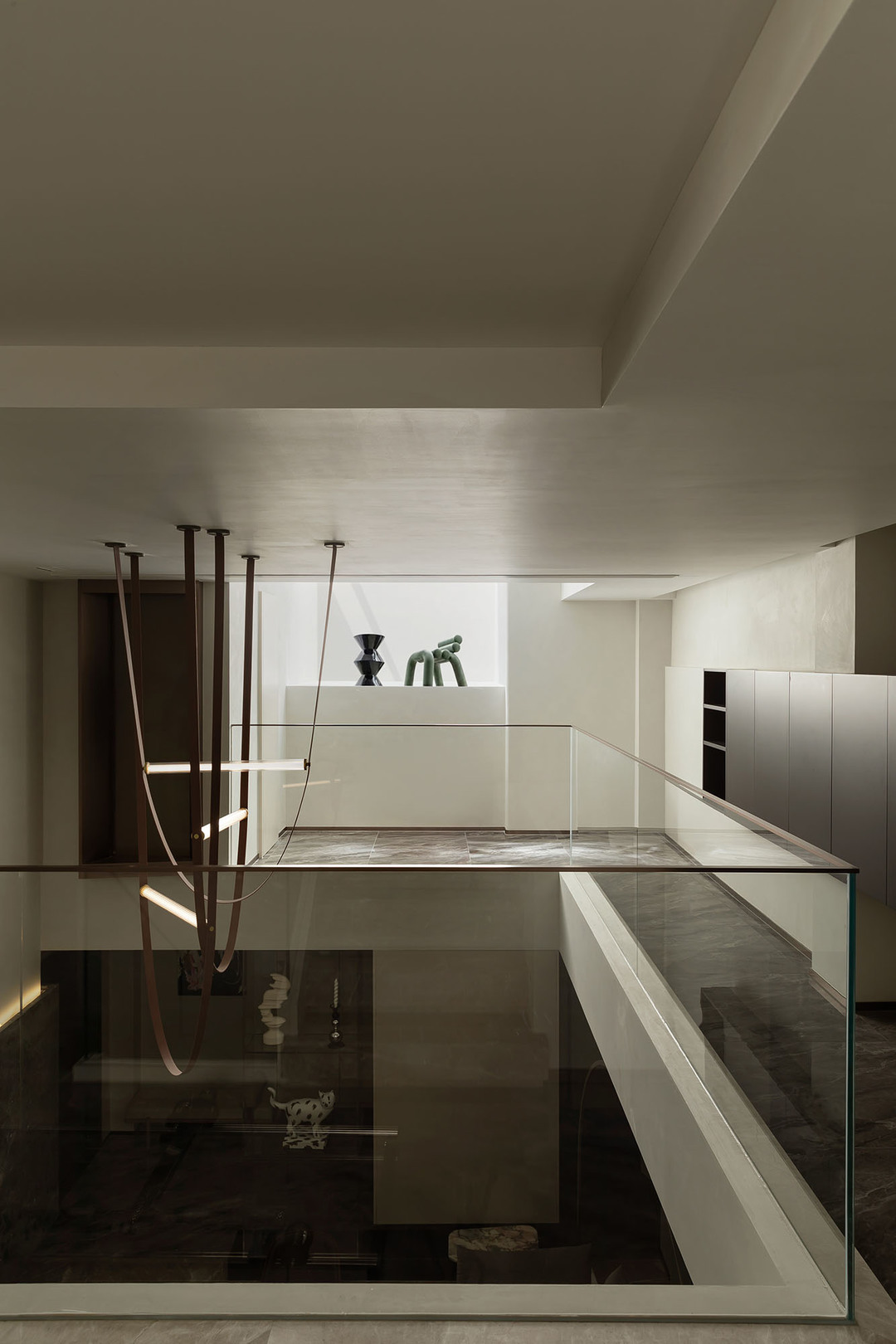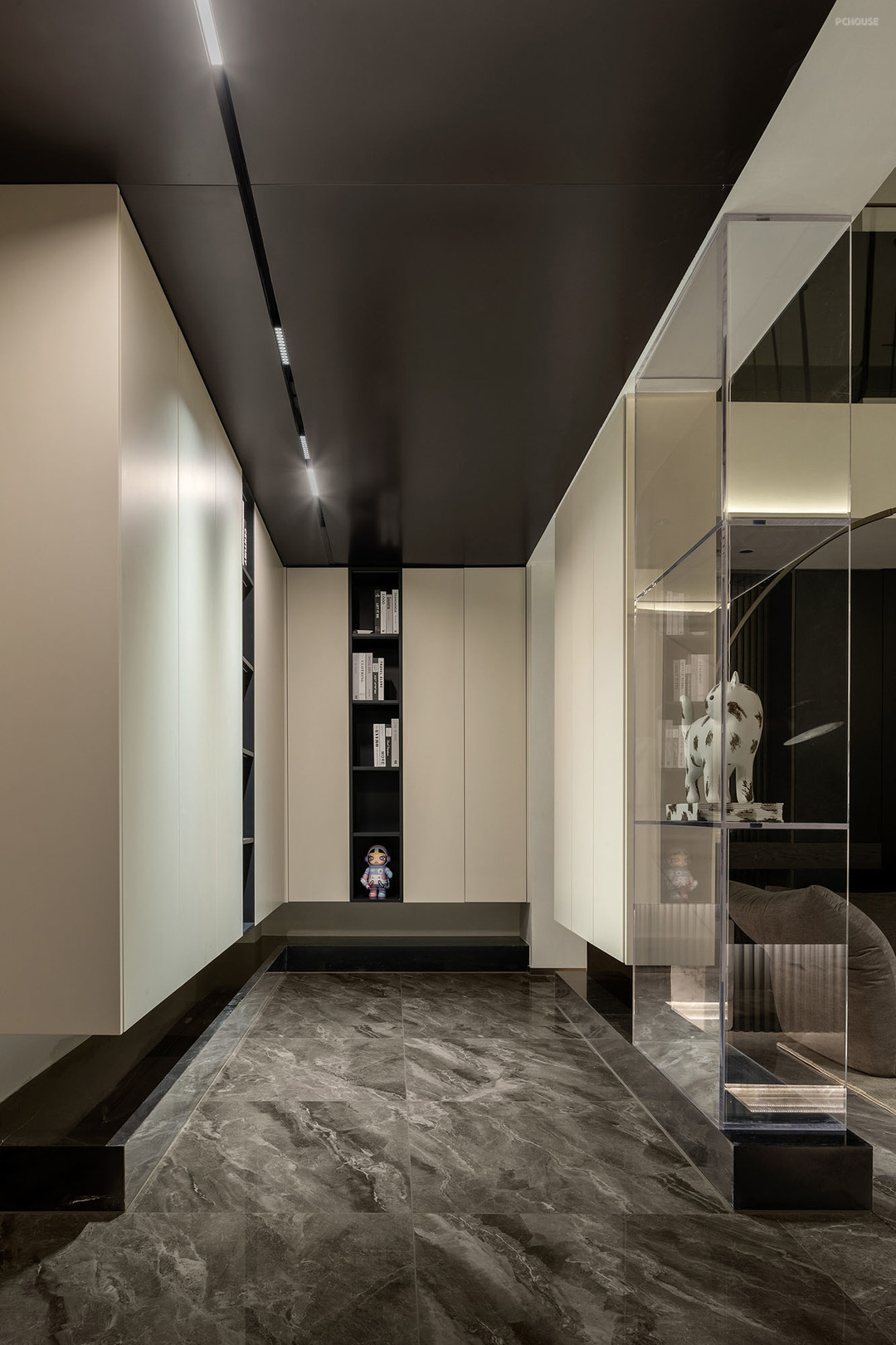 东芮希望这个空间除了承载全家人的生活,也可以完美的展示Molly玩偶,在上下的楼梯通道楼预留了挑空层板作为玩偶展示,展示区域的灯光也成为楼梯间的灯光,东芮收藏的玩偶们拥有了一个完美的“家”。