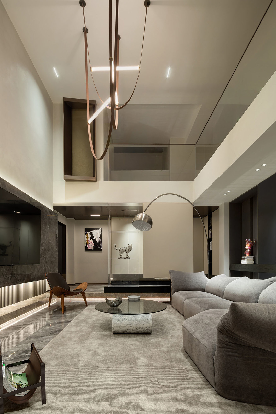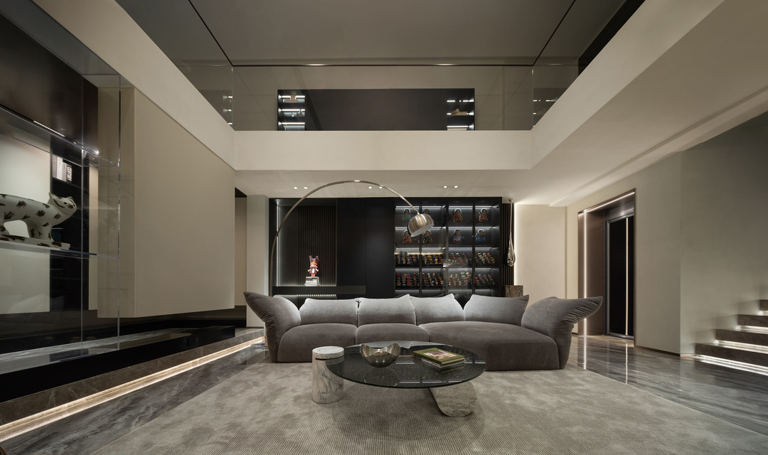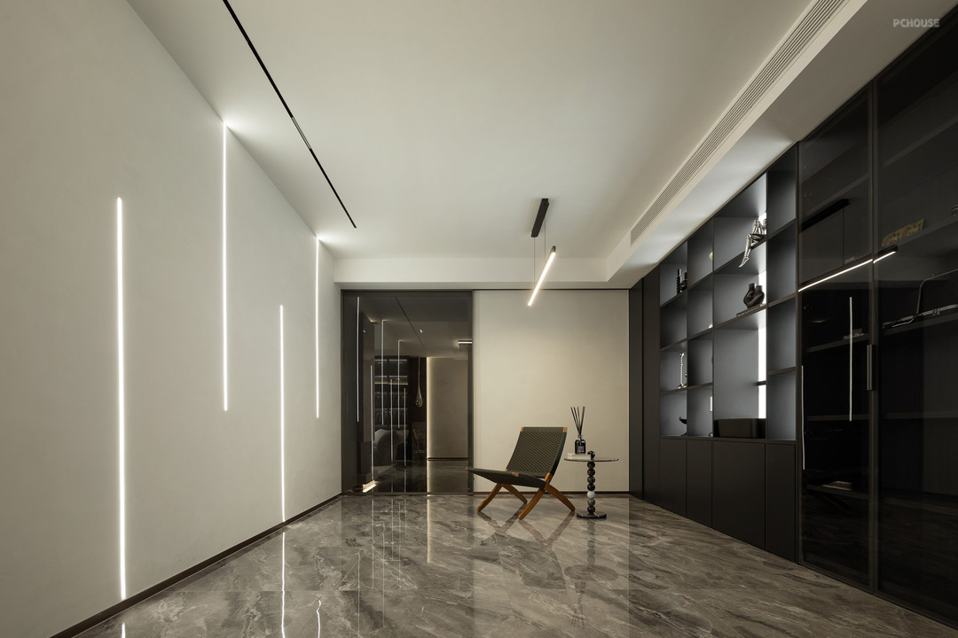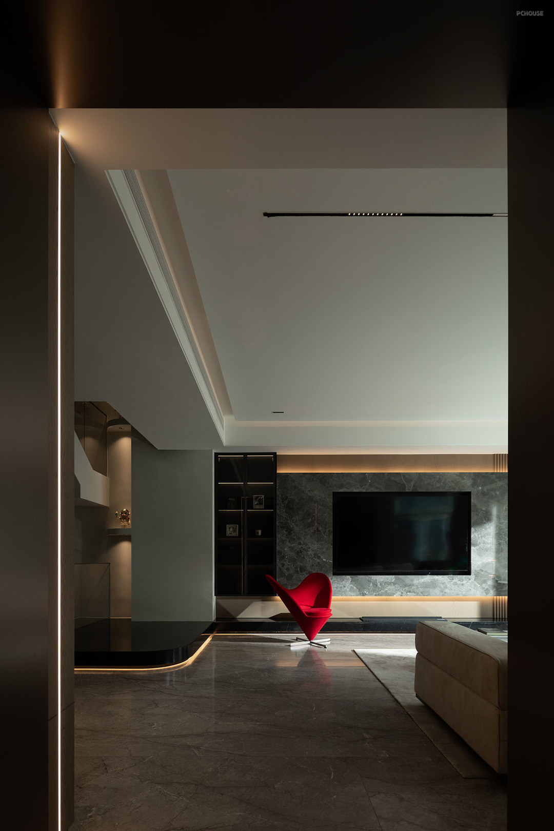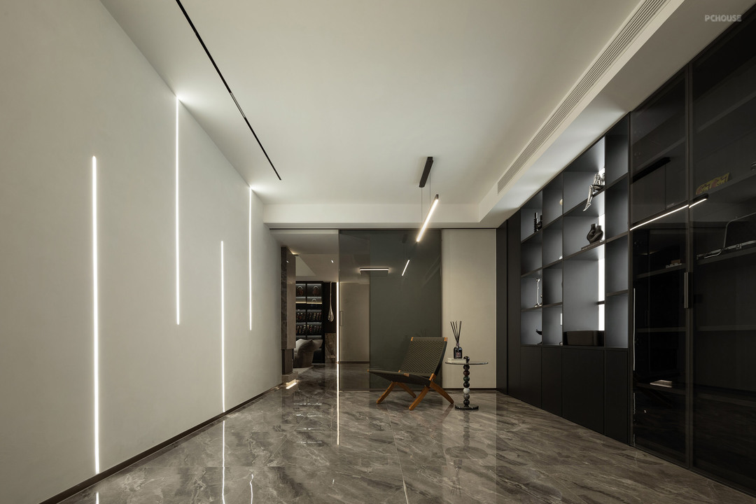 东芮希望这个空间除了承载全家人的生活,也可以完美的展示Molly玩偶,在上下的楼梯通道楼预留了挑空层板作为玩偶展示,展示区域的灯光也成为楼梯间的灯光,东芮收藏的玩偶们拥有了一个完美的“家”。