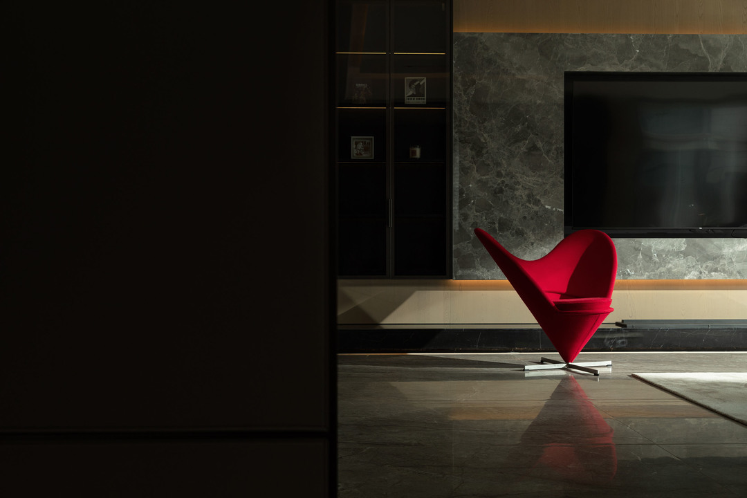 1958年设计的HEART-CONE Chair在傍晚的阴影里鲜明而耀眼,以突破常规的几何线条勾勒出爱心的形状,富有强烈的表现力。椅子不仅仅只是一把供人休息的家具,它成为空间的一部分,是主人对家的理解,更是设计想要传达的温暖。