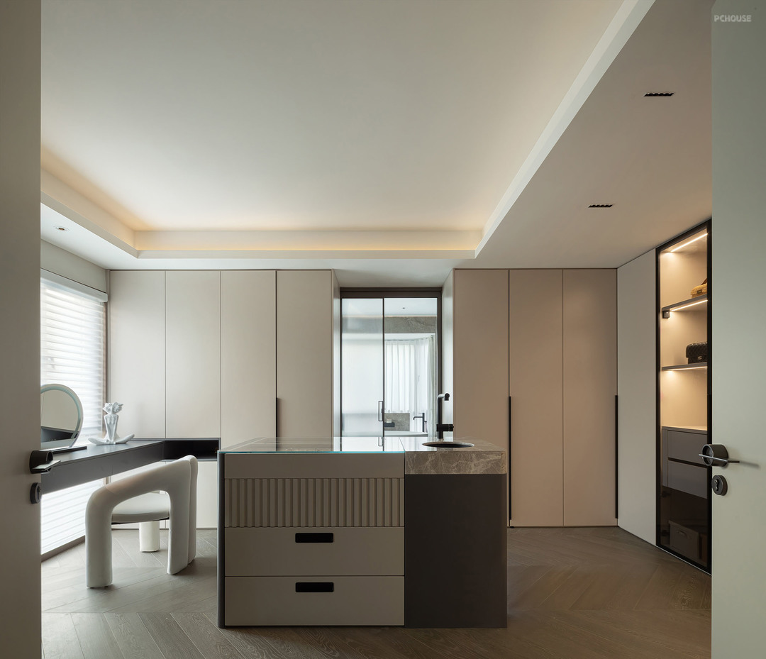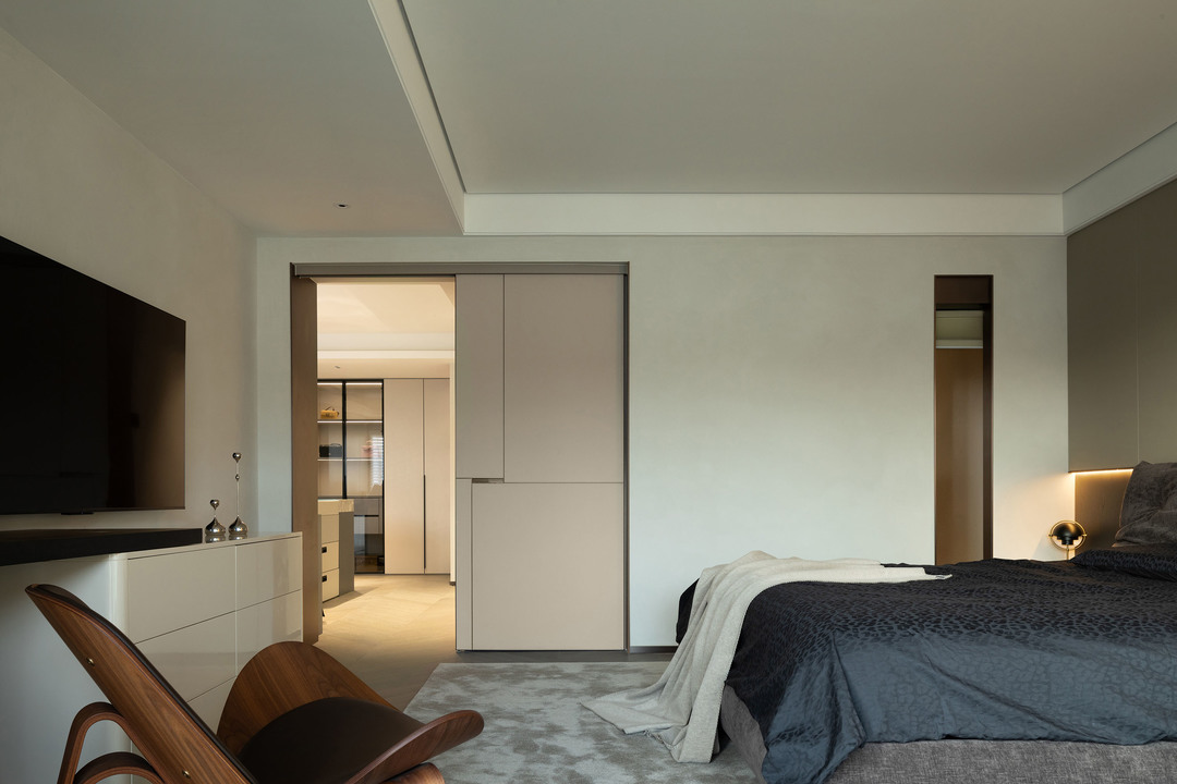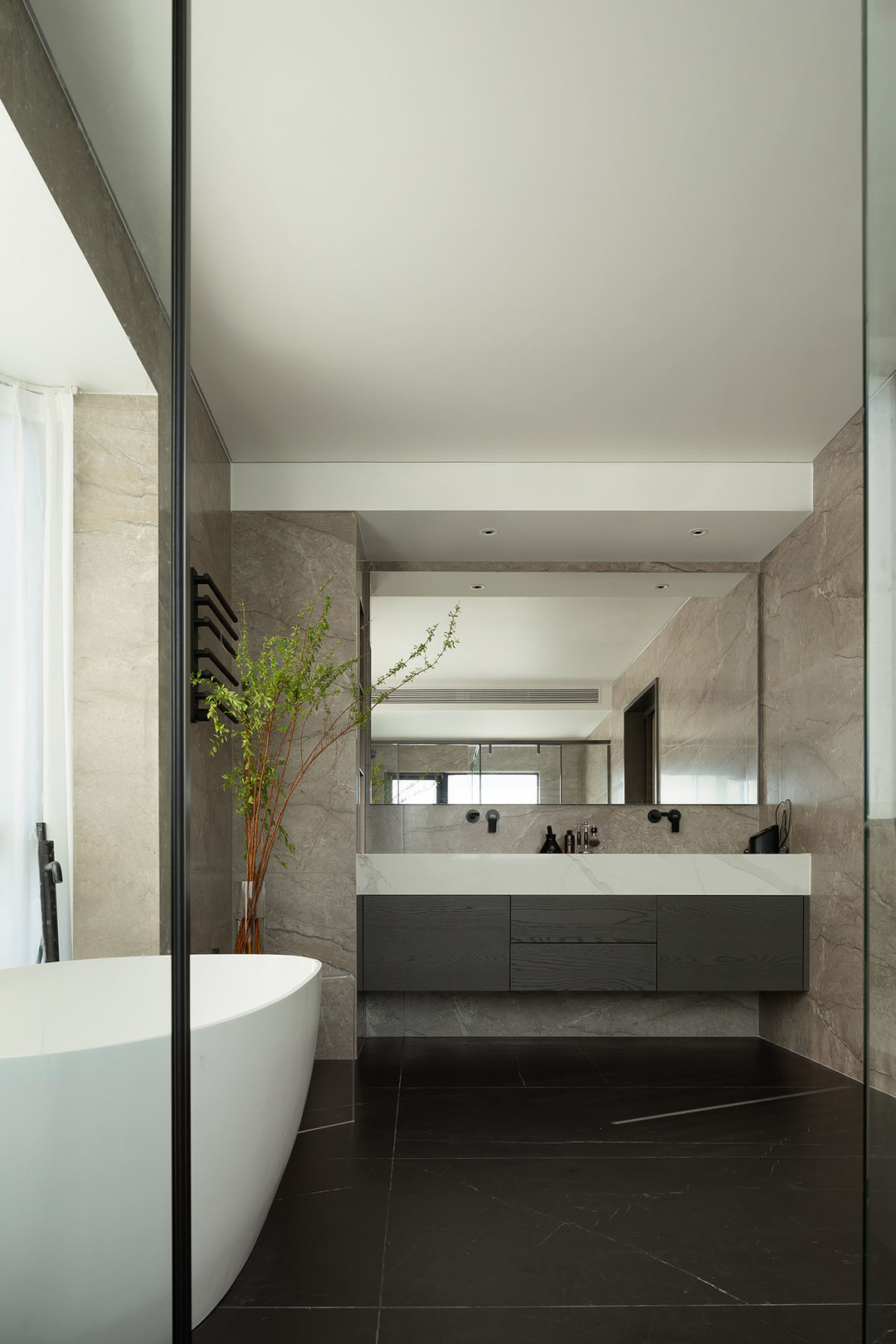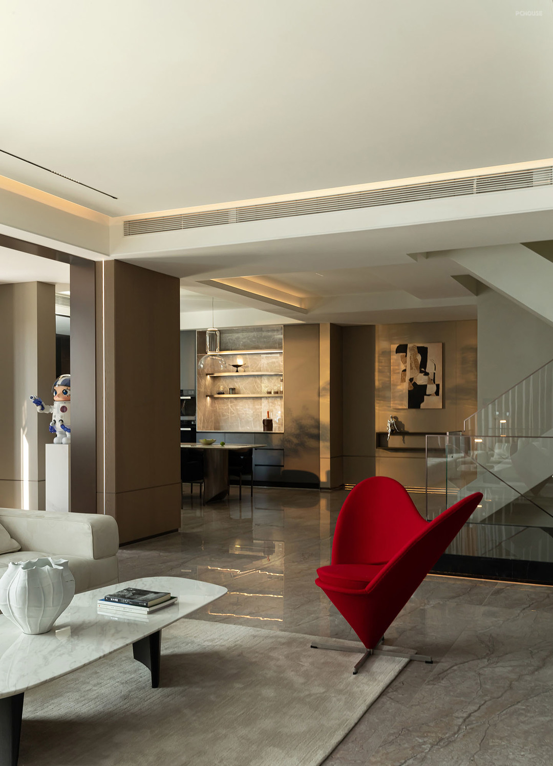 潮流易逝,气质不减,我们希望家历经时间而愈加经典,尽量简化装饰元素,以简约的线条和经典的色彩来表达,因此公共区域使用了不同色度的米和灰,织物、木材、石材相融合,平衡冷暖。
