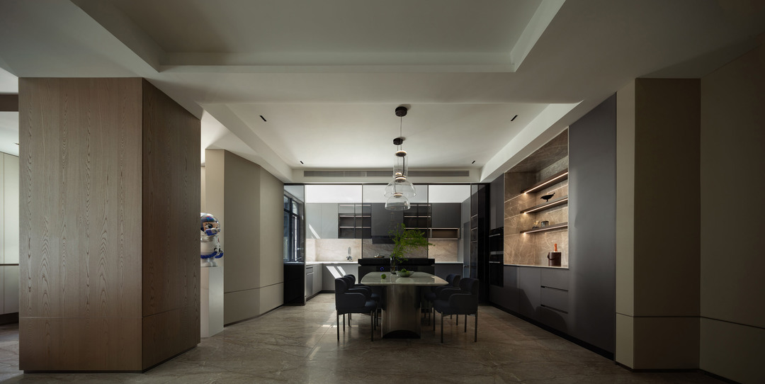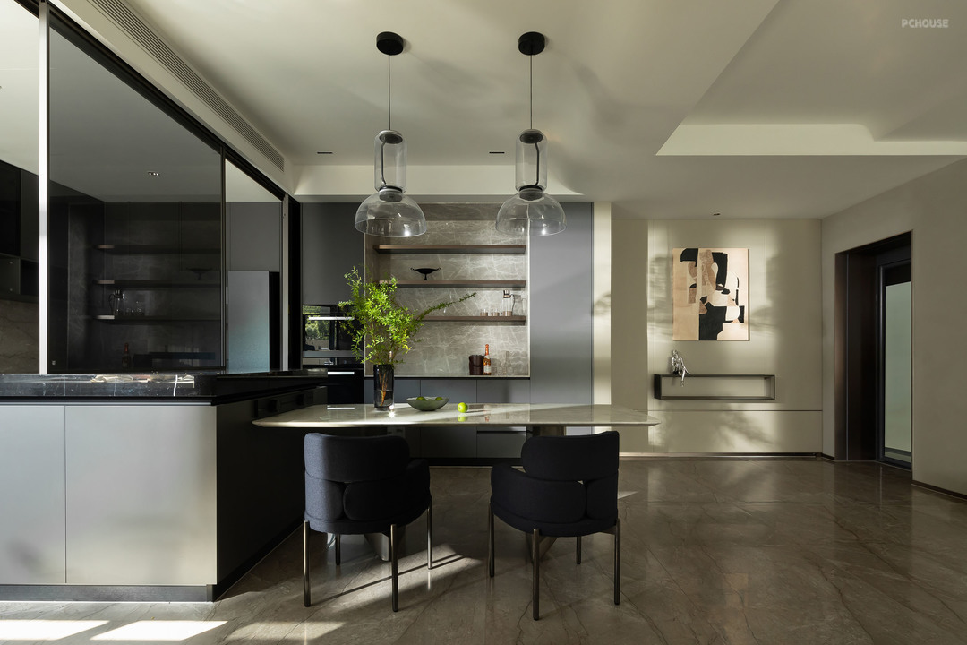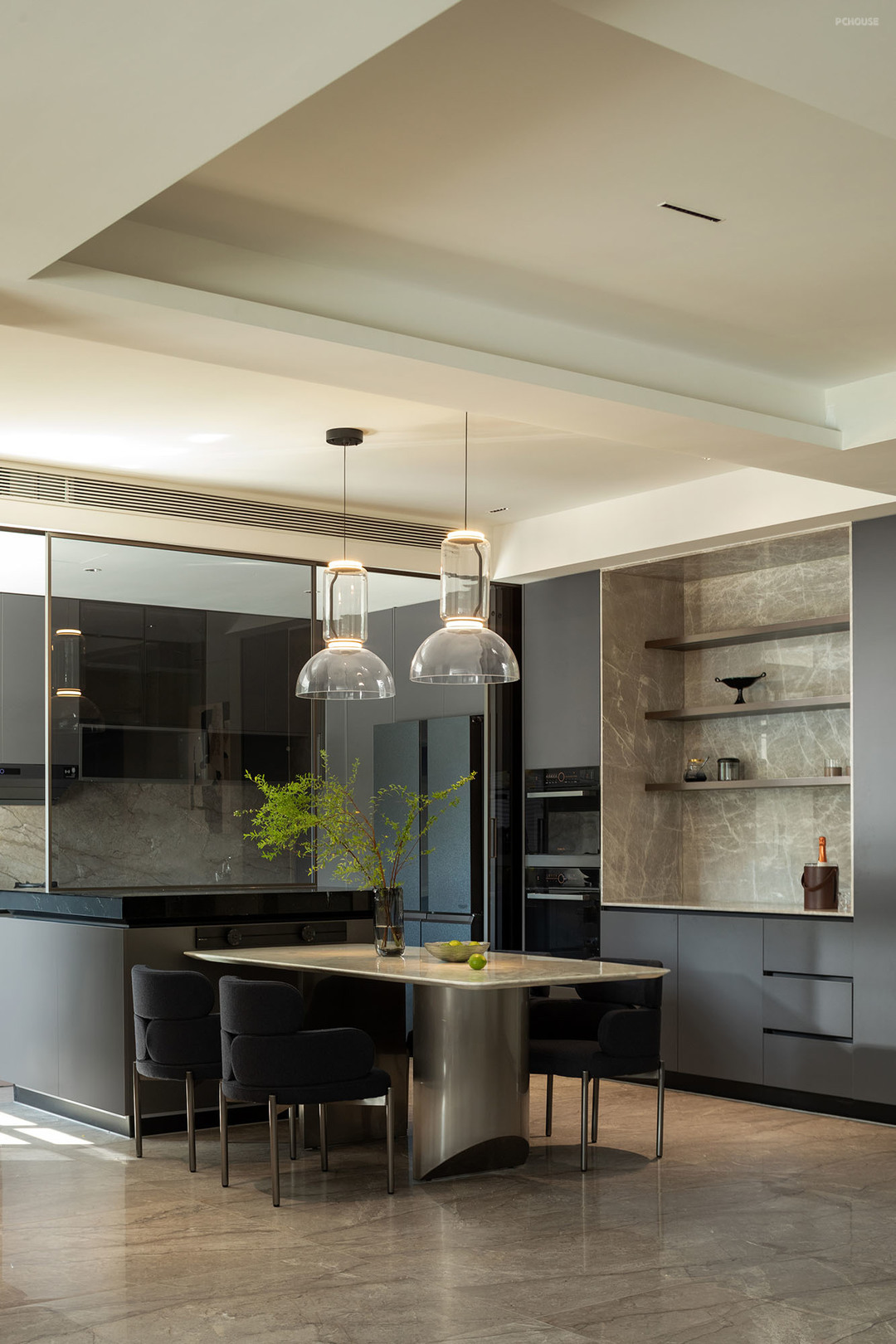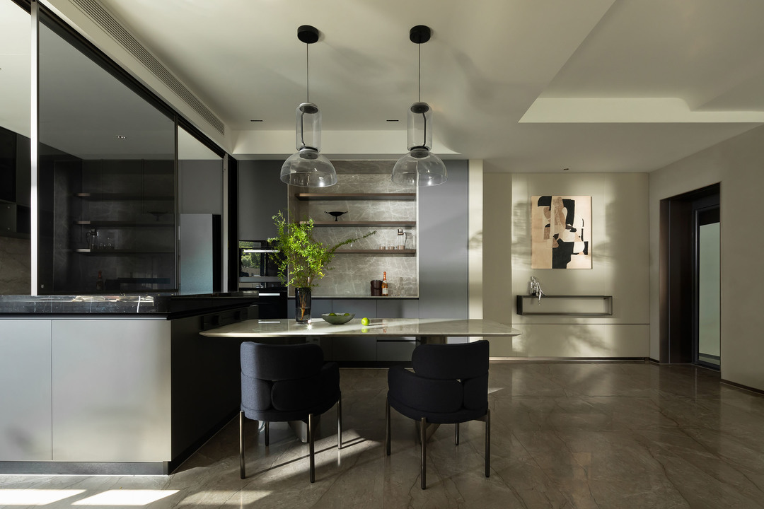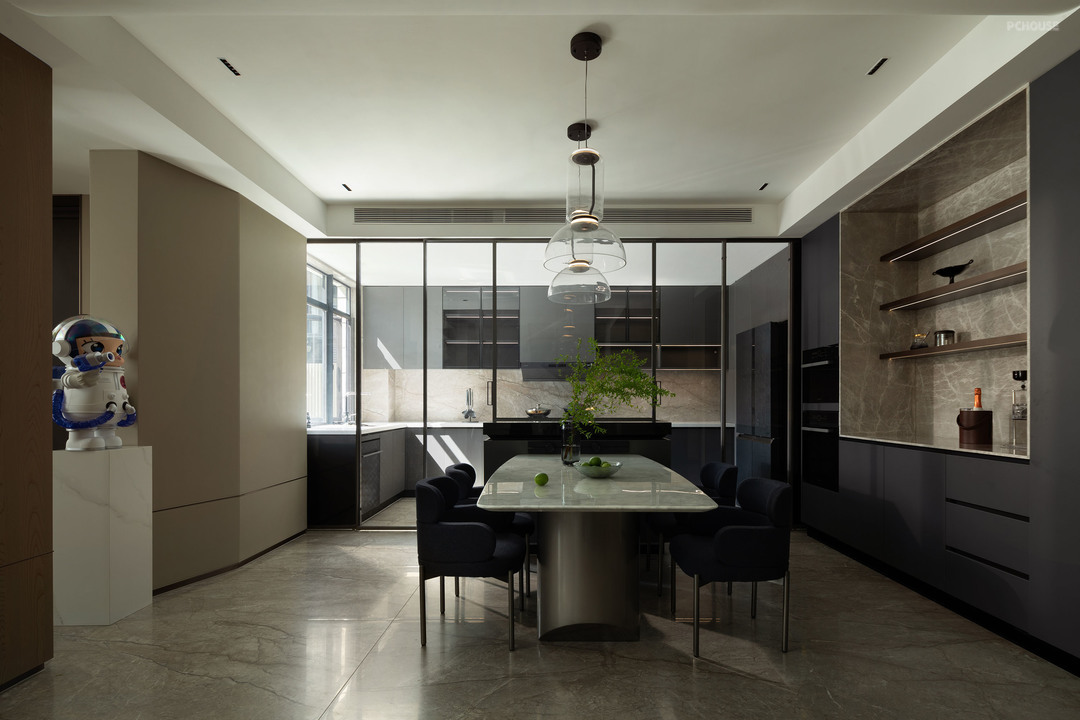 一层入户后是开阔的客餐厅,以半隔断的方式与客厅相连接,光线和空气得以自由流通。整面墙的高柜拥有强大的收纳系统,集合了咖啡、烘焙功能。灰色水波纹的大理石与深灰色的柜体,以最经典的方式演绎当代年轻人的生活方式。顶部的透明灯具让空间更显轻盈灵动。