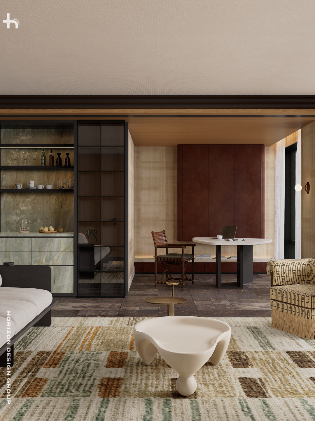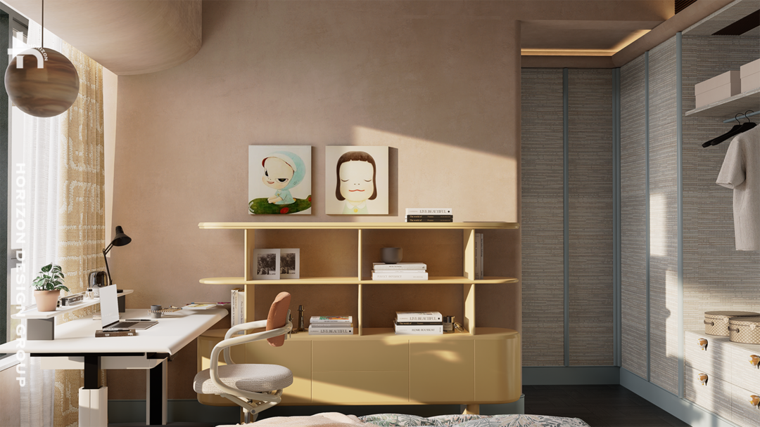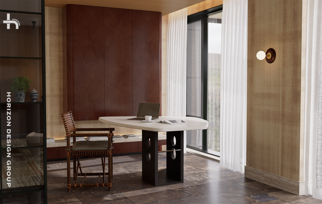 我们深谙,空间服务于生活的智慧。一个即可独立,又能融入客厅的书房空间,或者可以说是扩展会客的空间,更体现了实用主义和优雅的灵活性。