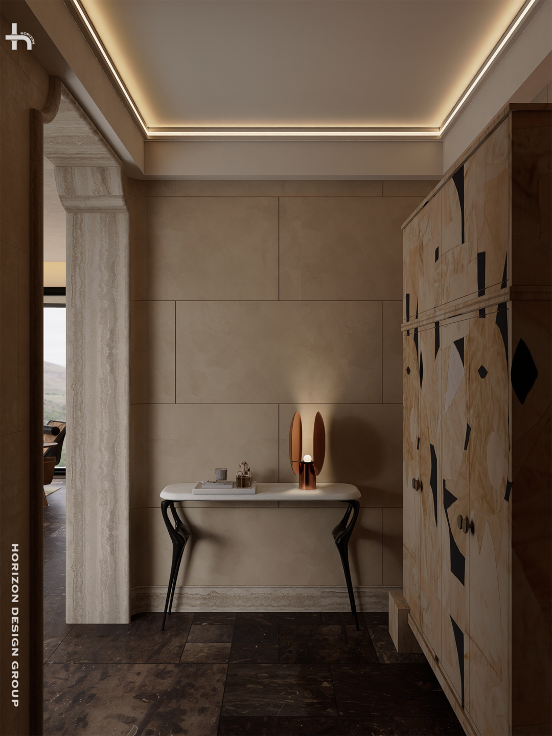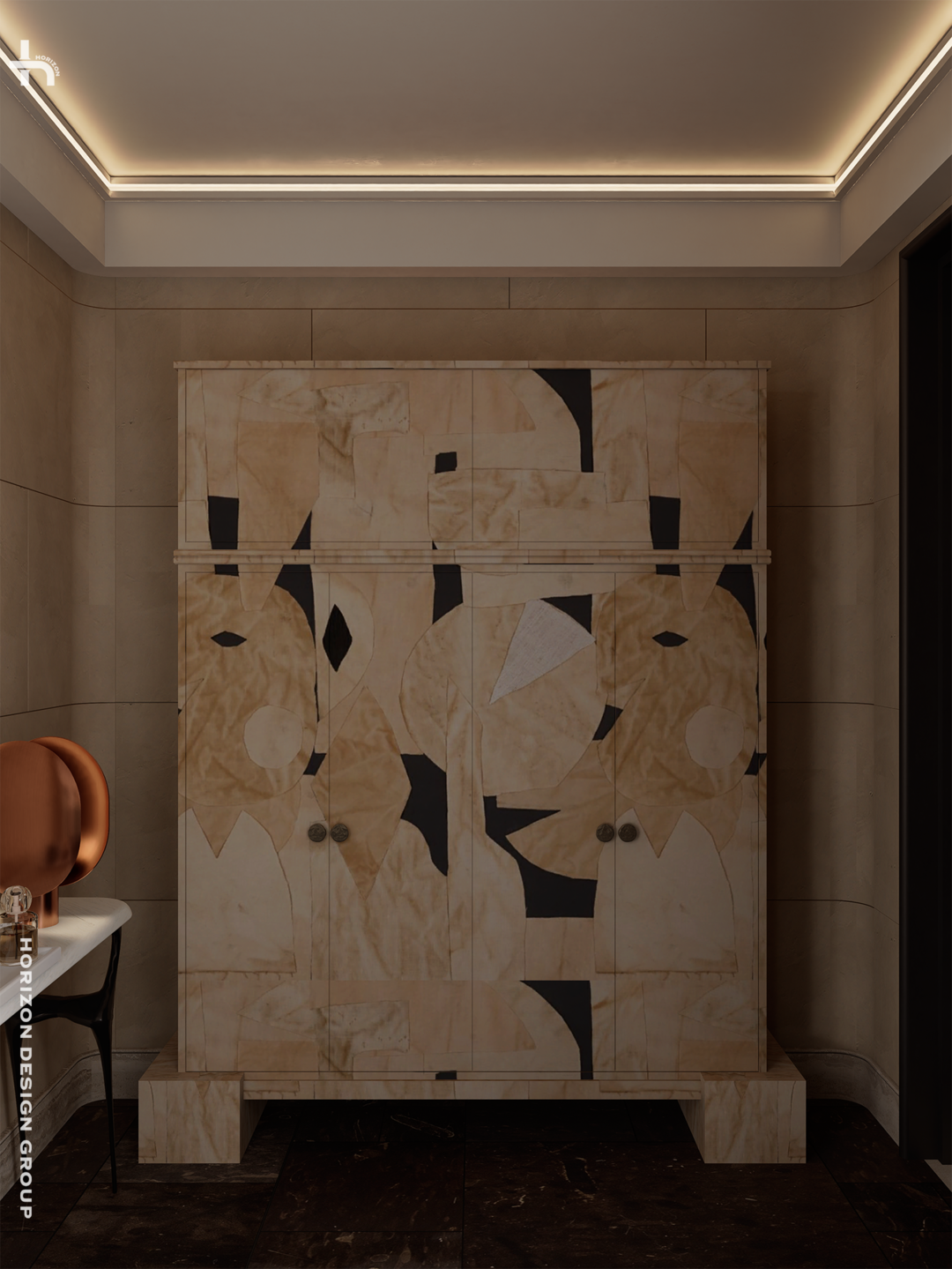 摒弃传统到顶鞋柜的压迫感,我们为审美挑剔的业主奉上更具艺术性的解法— 一面精心设计的艺术玄关柜。以一种更为轻盈、更具雕塑感的姿态呈现。原创设计的底座造型,拼接式样柜门,传递着老钱风骨中那份对细节与质感的永恒追求。