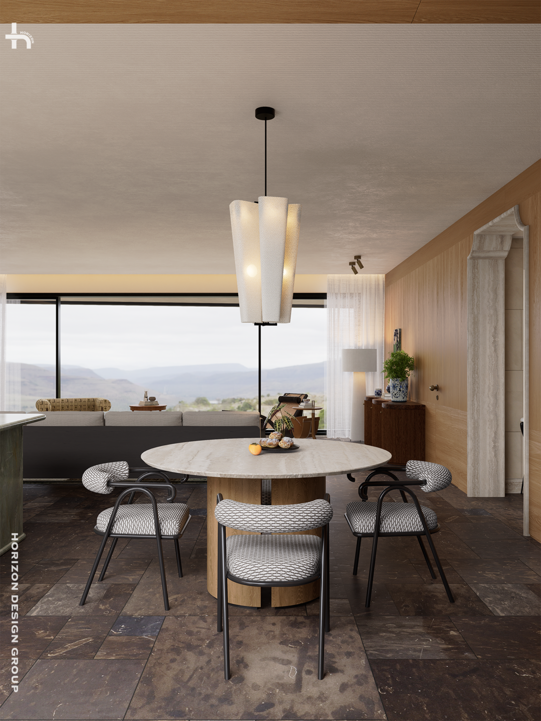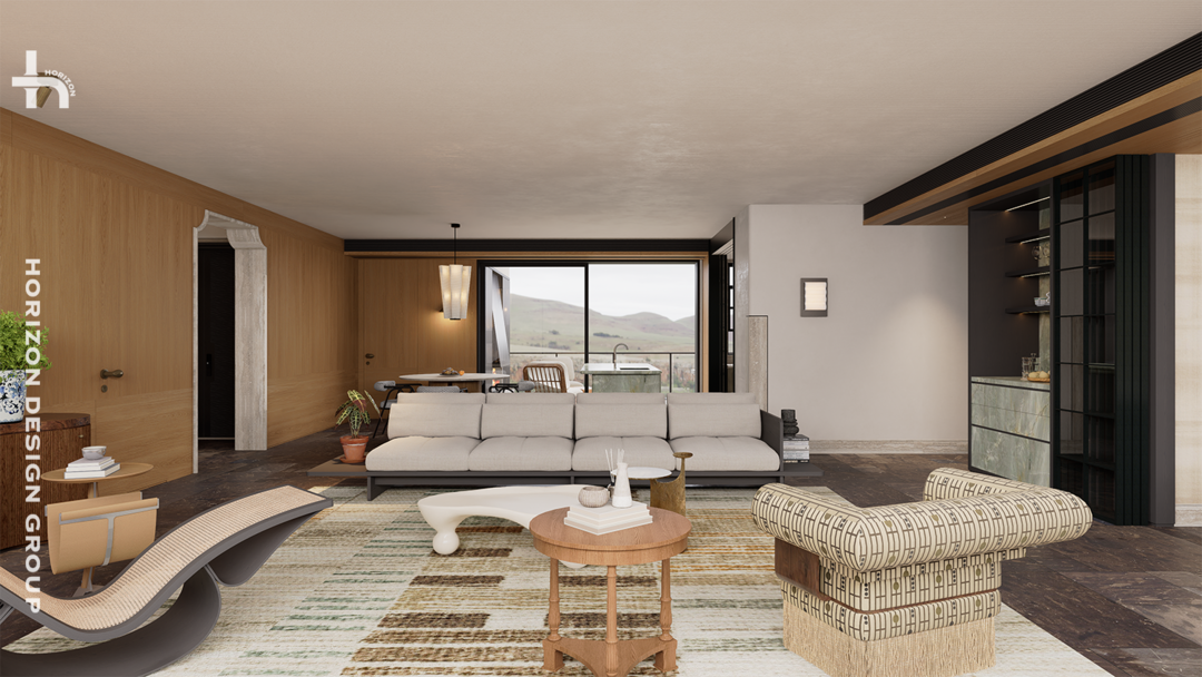 天然洞石包覆的造型垭口,如庄重的廊柱,优雅分隔出独立玄关。穿越垭口,步入开阔明亮的公区,此间有动静相宜的转换,也正是四代住宅「室内外共生」的理念的映照。