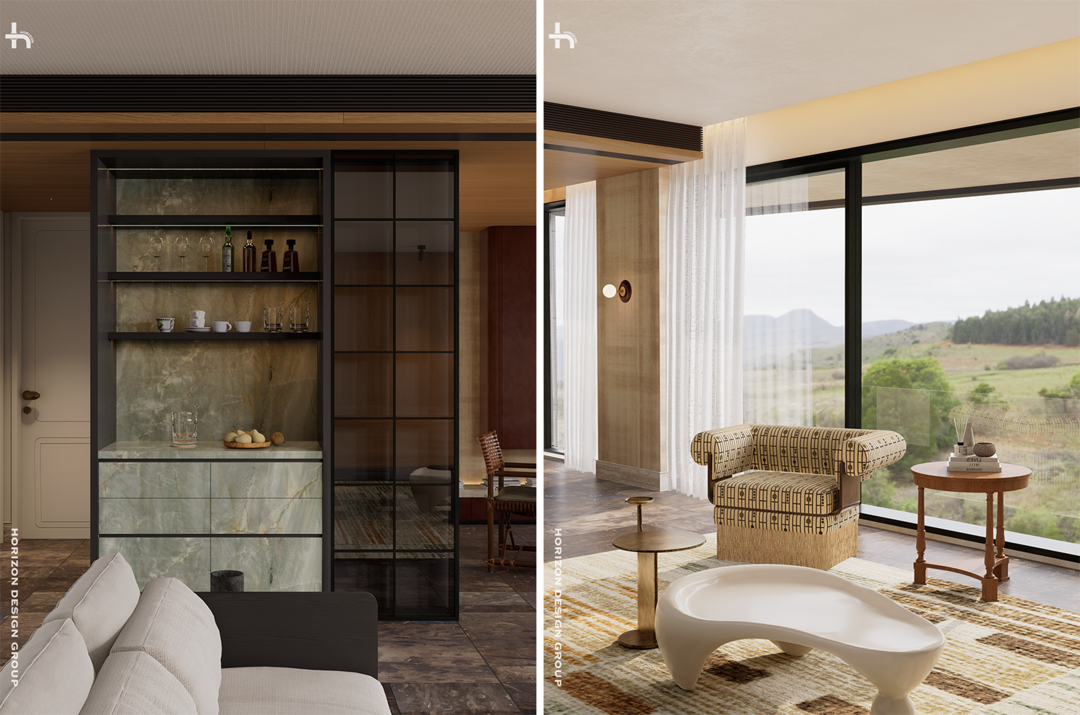 空间的主旨是生活、交流与艺术欣赏,而非被动娱乐。因此,最大化引入自然光、景致,模糊室内外界限,体现了对自然、季节更替的珍视。解放出来的墙面形成水吧台,成为会客厅的功能补充,亦成为空间本身优雅线条的一部分。