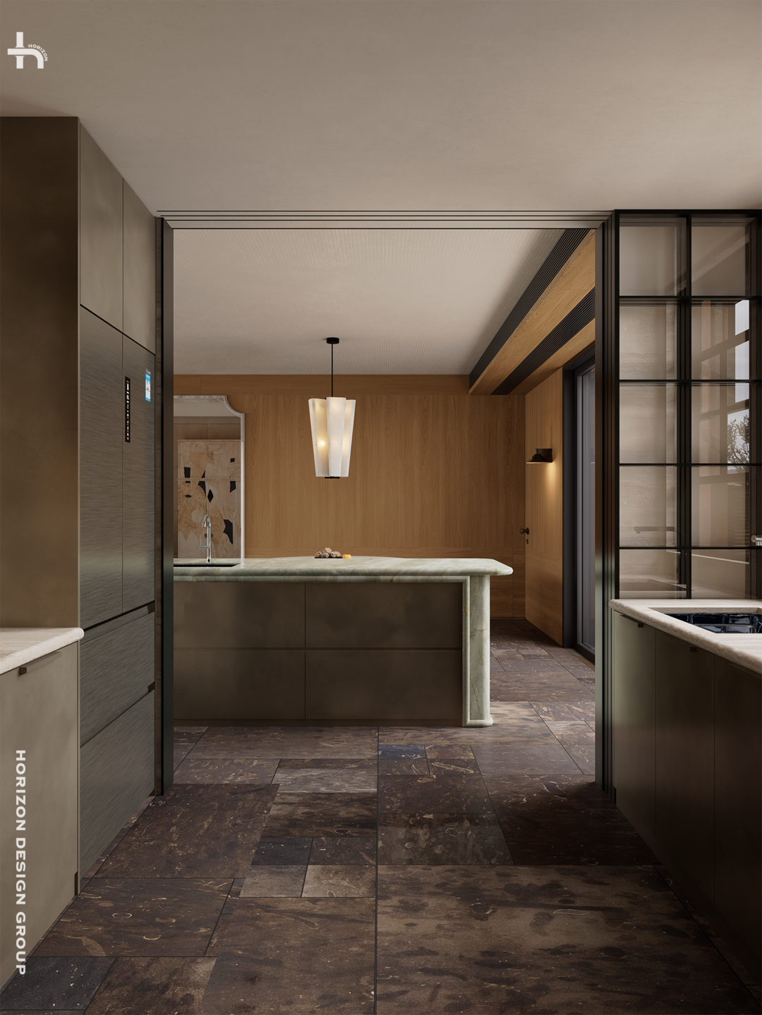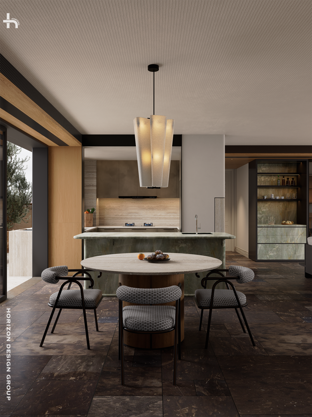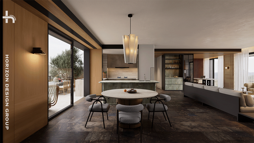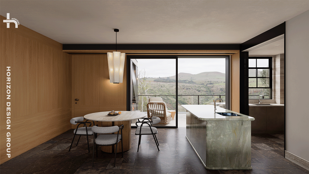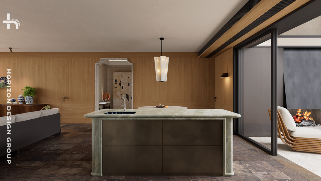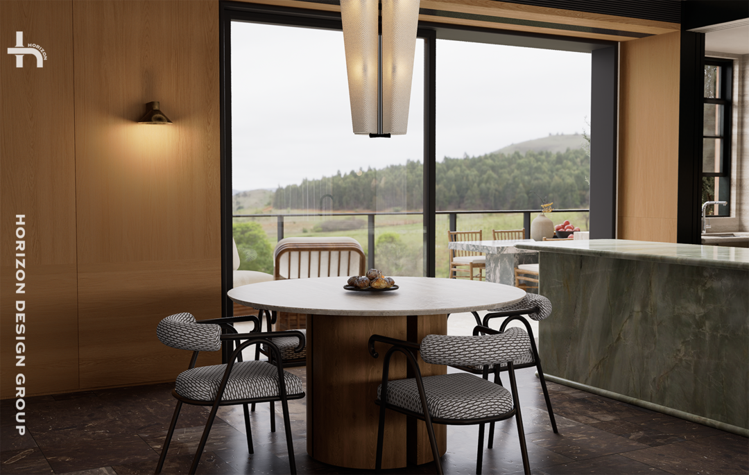 天然绿色岛台、洞石与木质相结合的圆形餐桌,融合的材质语言使其成为空间中不可忽视的功能枢纽与视觉焦点。其独一无二的纹理与色泽,仿佛将自然的切片引入空间,成为更具艺术化的存在。