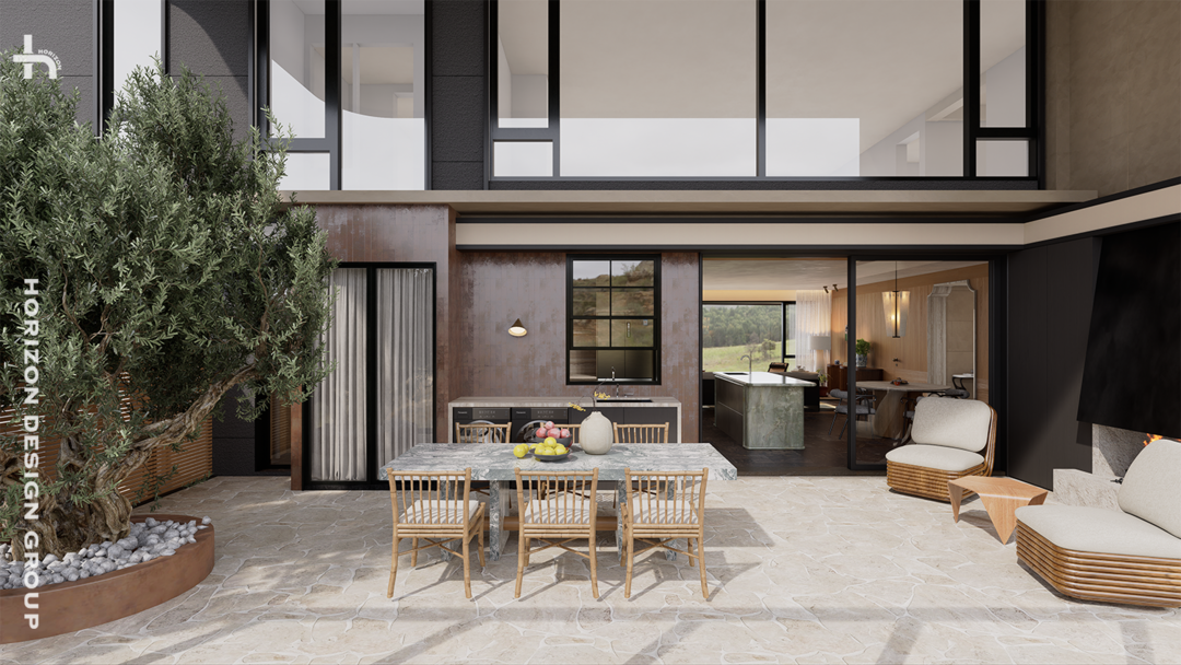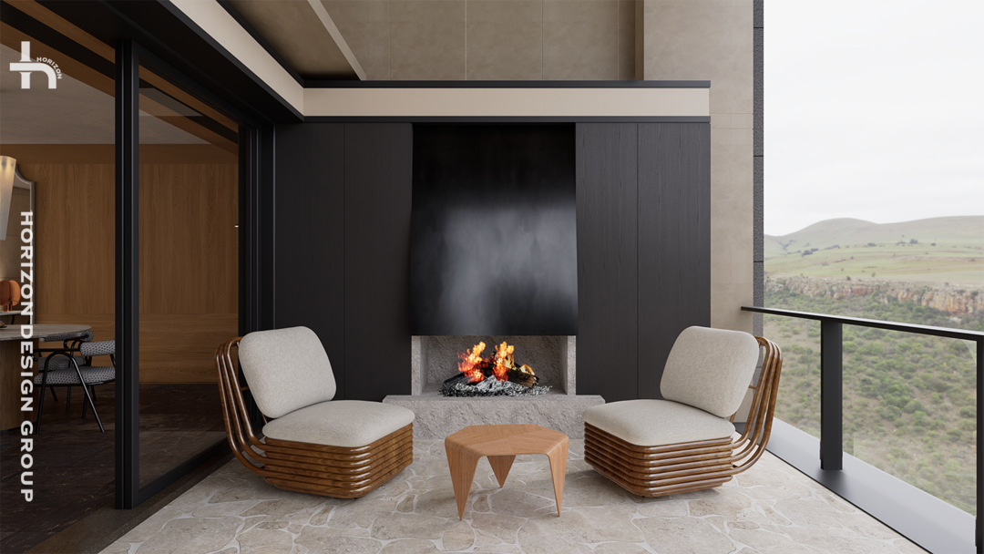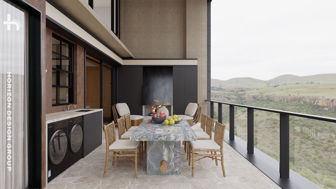 相较于室内空间的璞玉细琢,露台空间化繁为简,回归本质。从质感和实用出发,耐用易打理的地面、强大的收纳、极具质感的金属真火壁炉,最后回到整合的洗衣区。每一项都直指核心需求,并力求以最优雅的方式呈现。