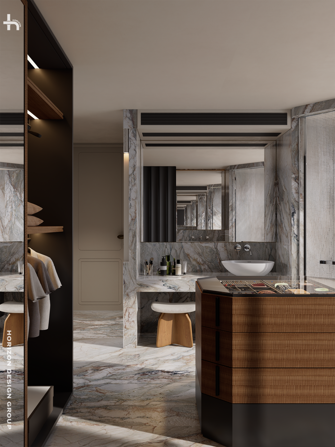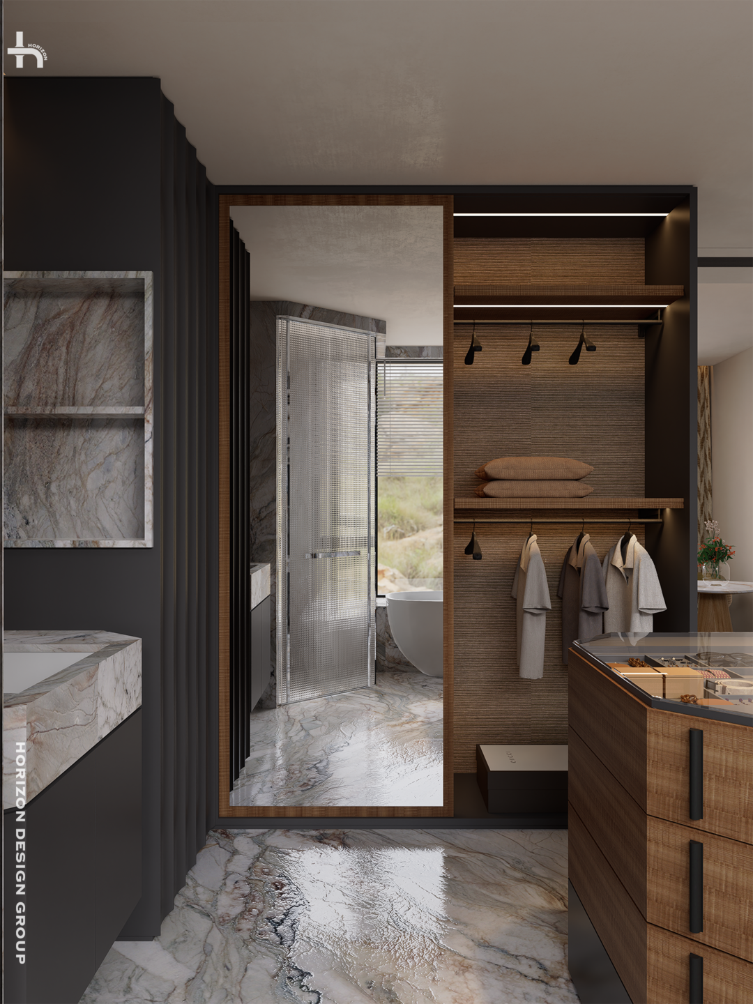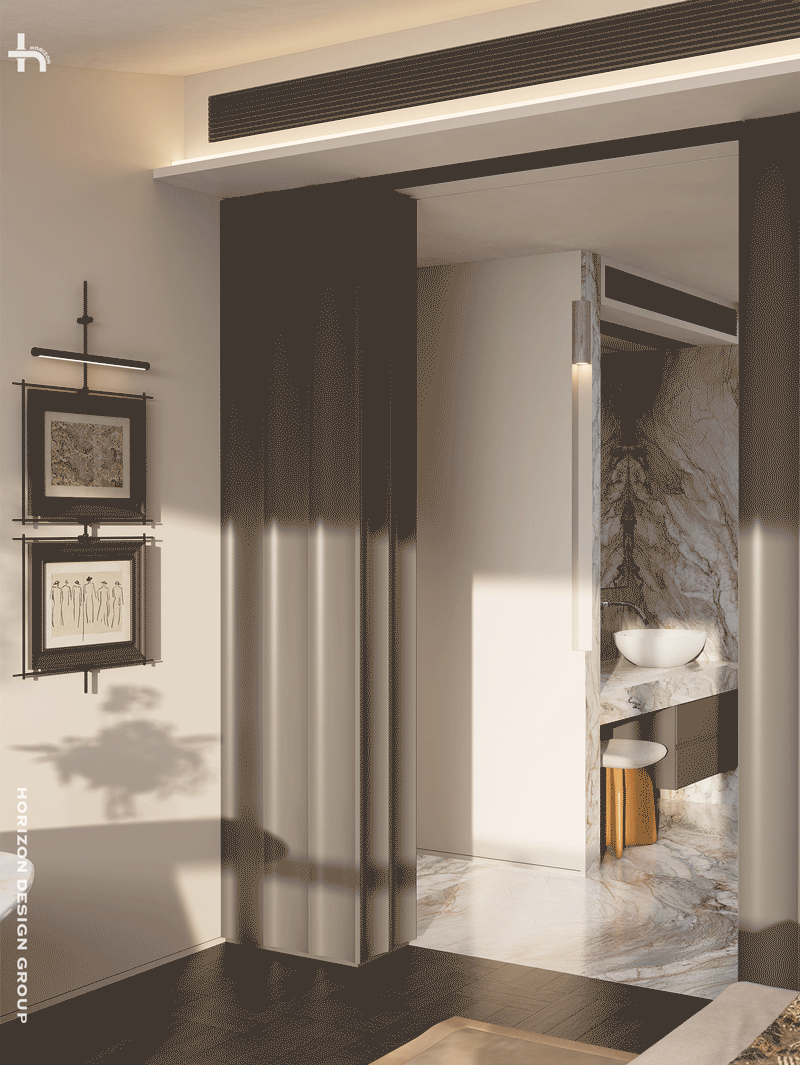 主卫以「环形」动线为核心,彻底实现干湿分离。宽敞的双洗手台、独立淋浴区、窗边浴缸,都提升屋主使用的便利和舒适度。在材质和氛围的雕琢上,我们倾注大量心血。明亮通透的石材与温润深沉的木作形成了强烈的碰撞,整体的色调、光线及材质和谐融合,成为空气气质的点睛。