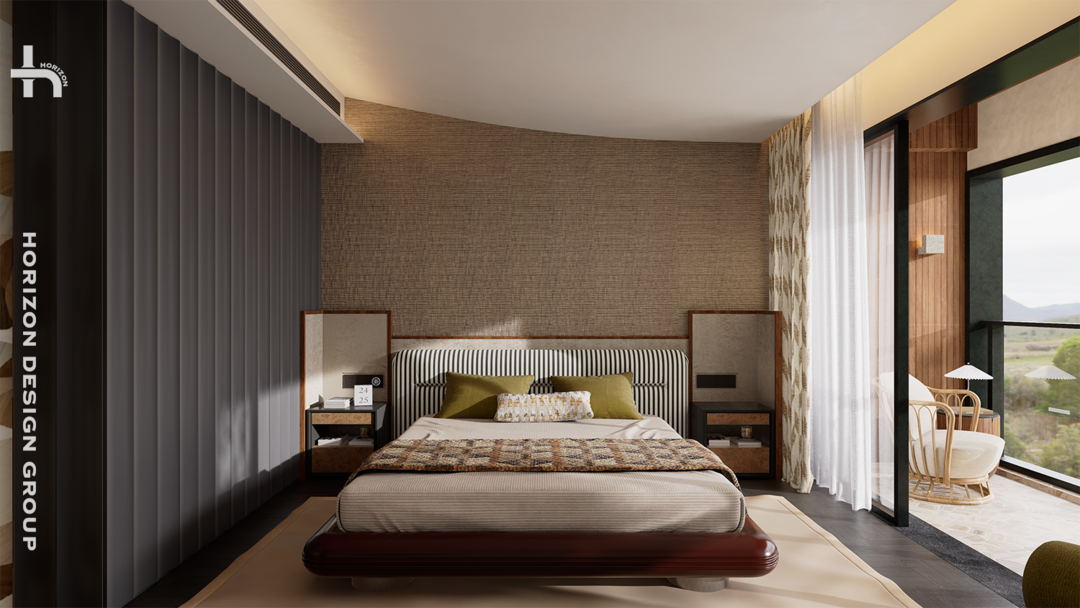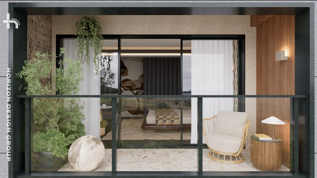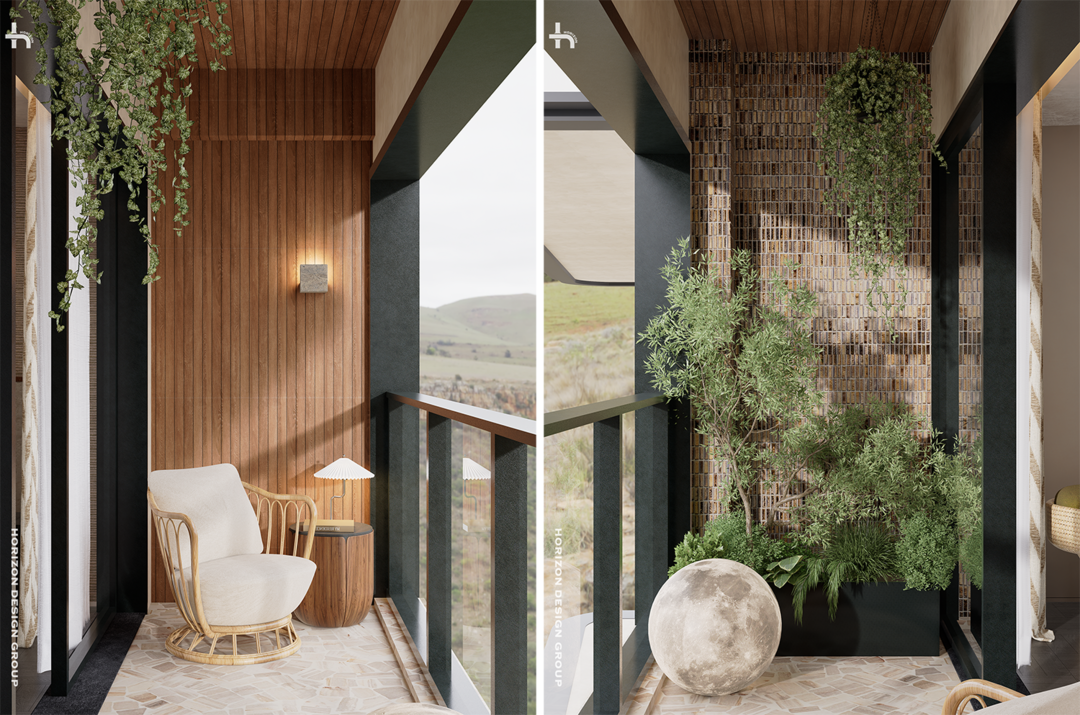 主卧阳台延续露台的材质语言,通过小砖的粗粝与木条的温润,构建连贯的空间记忆;“随意洒下”的绿植,让自然元素以生长的姿态融入。