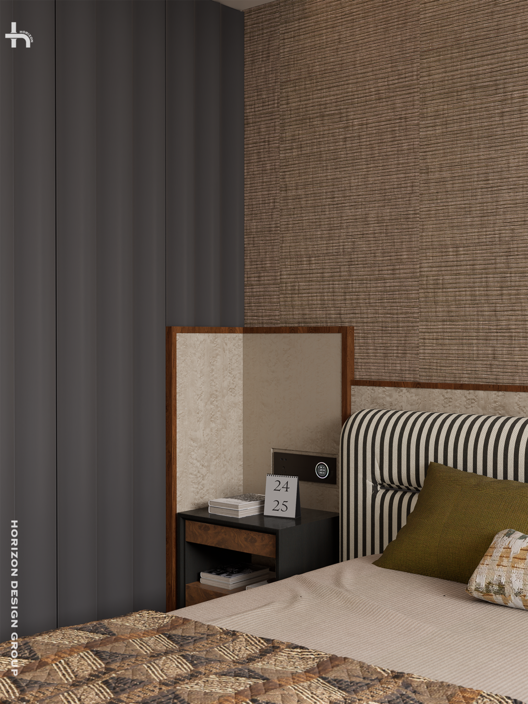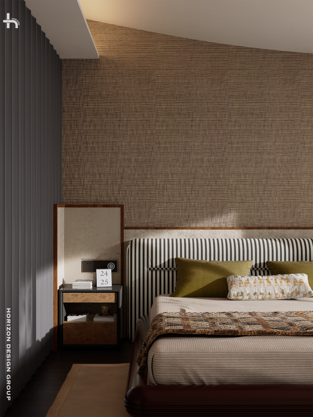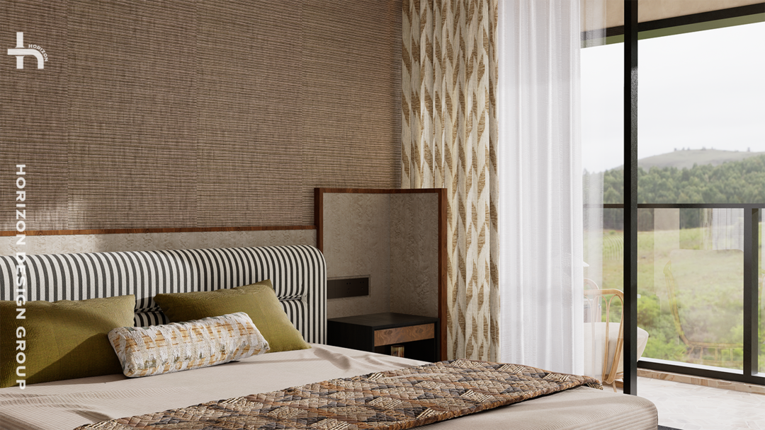 整个主卧的质感,藏着四代住宅「自然材质」与「老钱风」的交响。空间里使用了多种带手绘花纹的墙画、雀眼木与木质边框拼接做的背景,看上去很有岁月感的木皮被设计成了床头柜,带来了很妙的碰撞感。