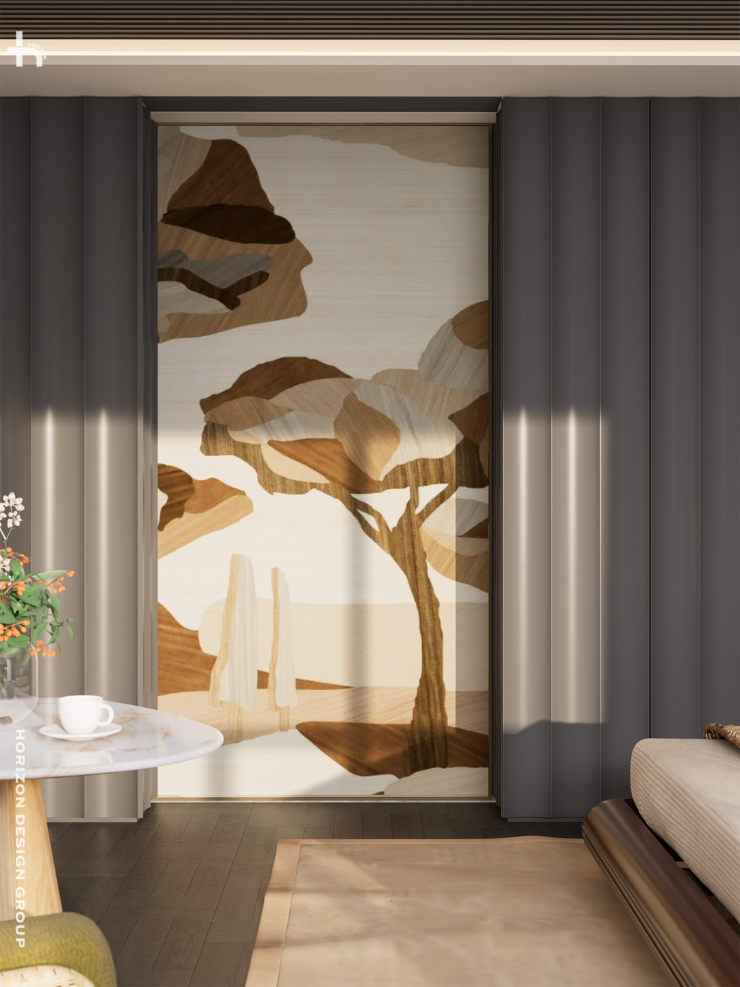 我们在滑门设计上做了呼应:引入ARTE墙画,各种颜色和纹理的木皮相拼接,形成这一副梧桐树。笔触间的自然意象自带艺术沉淀感。