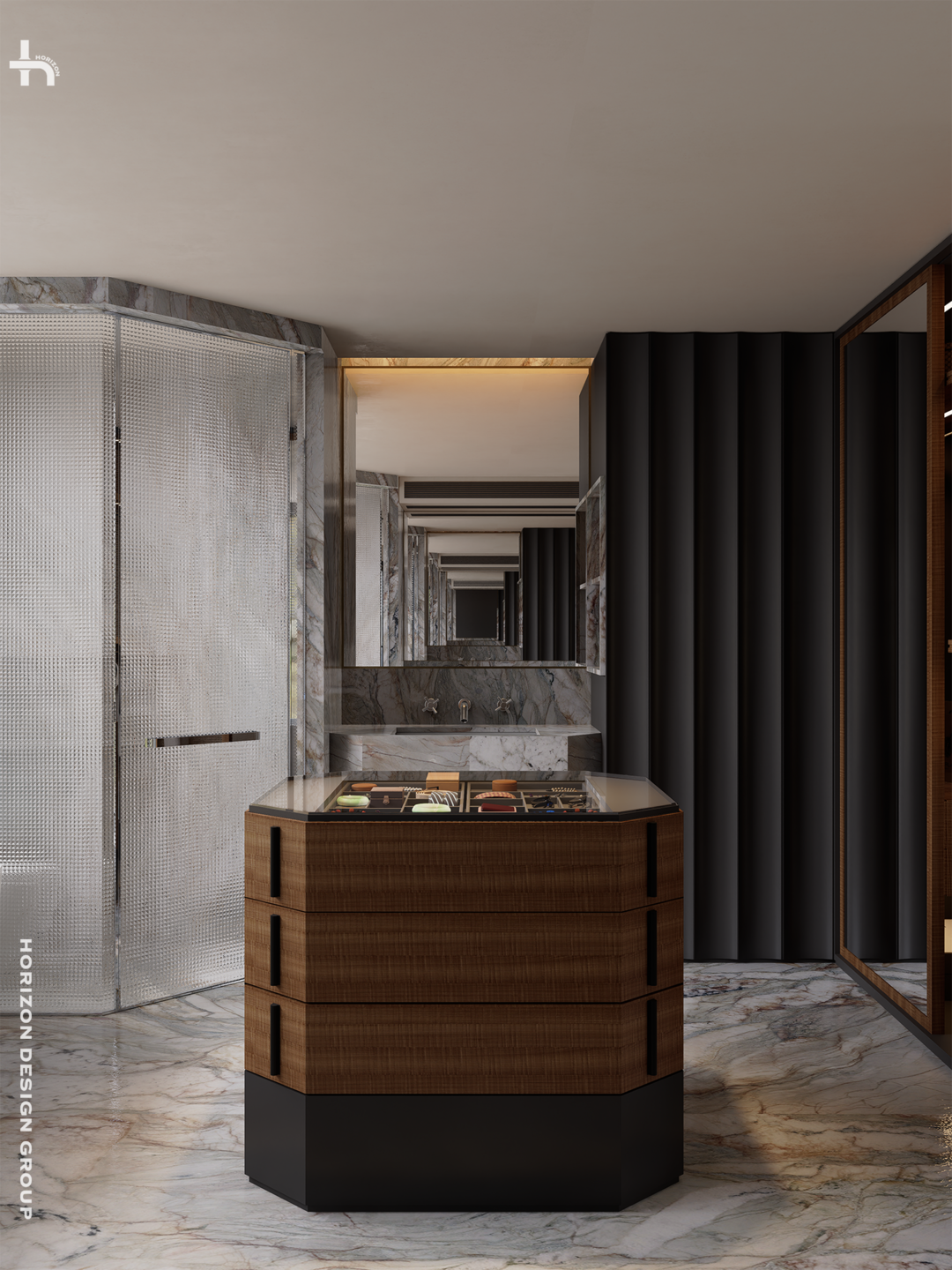 整个空间的材质语言高度统一且极具份量感,通过天然材质的肌理、京砖石的厚重、罗马柱门廊的仪式感,多重维度交织,不仅满足功能所需,更在第一时间彰显了整个居所的艺术底蕴与沉稳厚重的老钱气质。