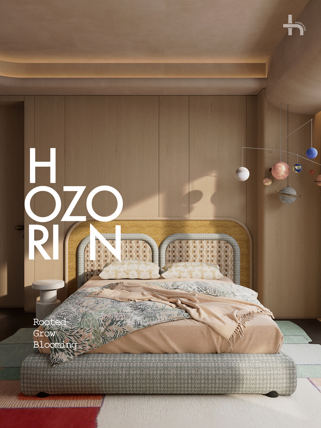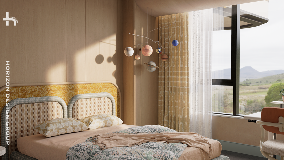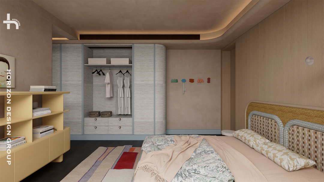 小朋友的空间用了活泼、浪漫的颜色去融合,这些色彩并非点缀,而是平均分布、交织共生,充满了生命力。每一件家具都洋溢着童心,无论是独特的床头柜、充满想象力的挂钩、挂件,空间因此明亮、鲜活。