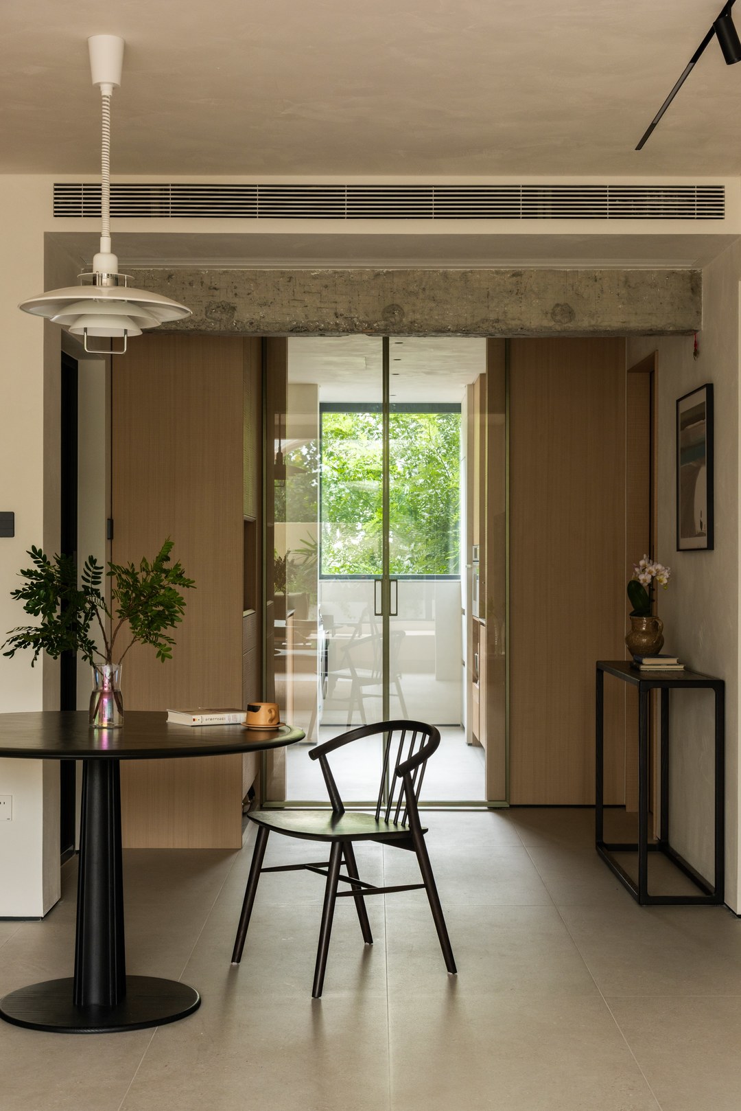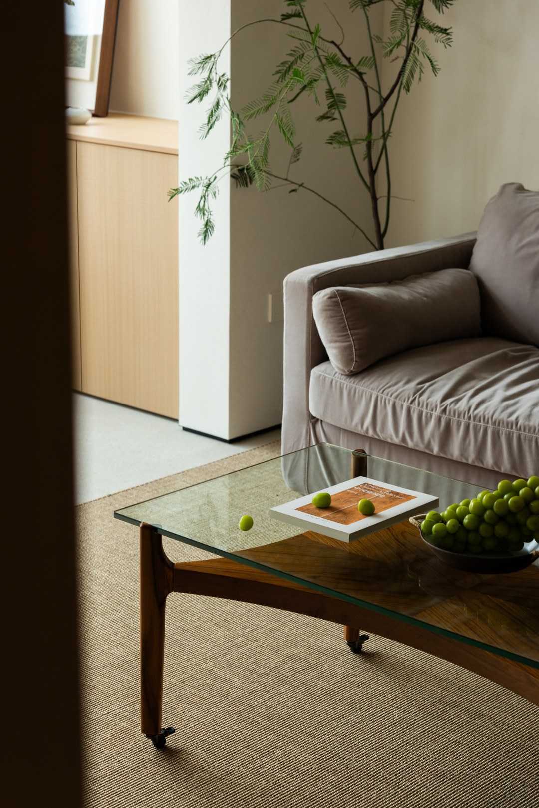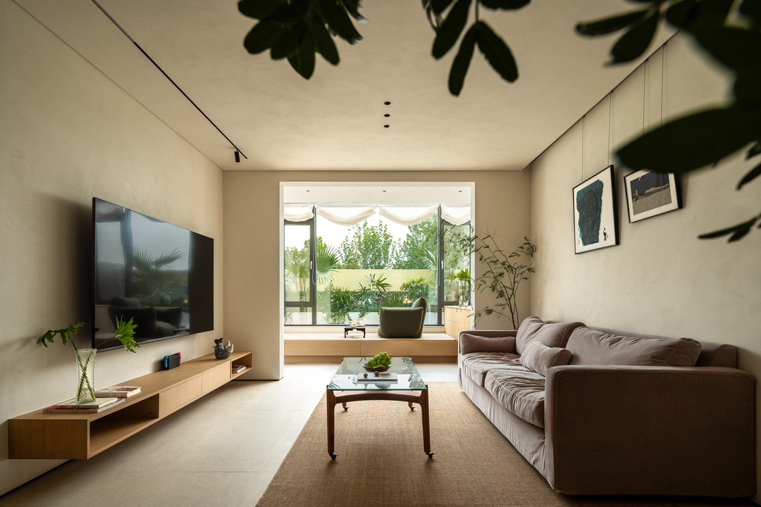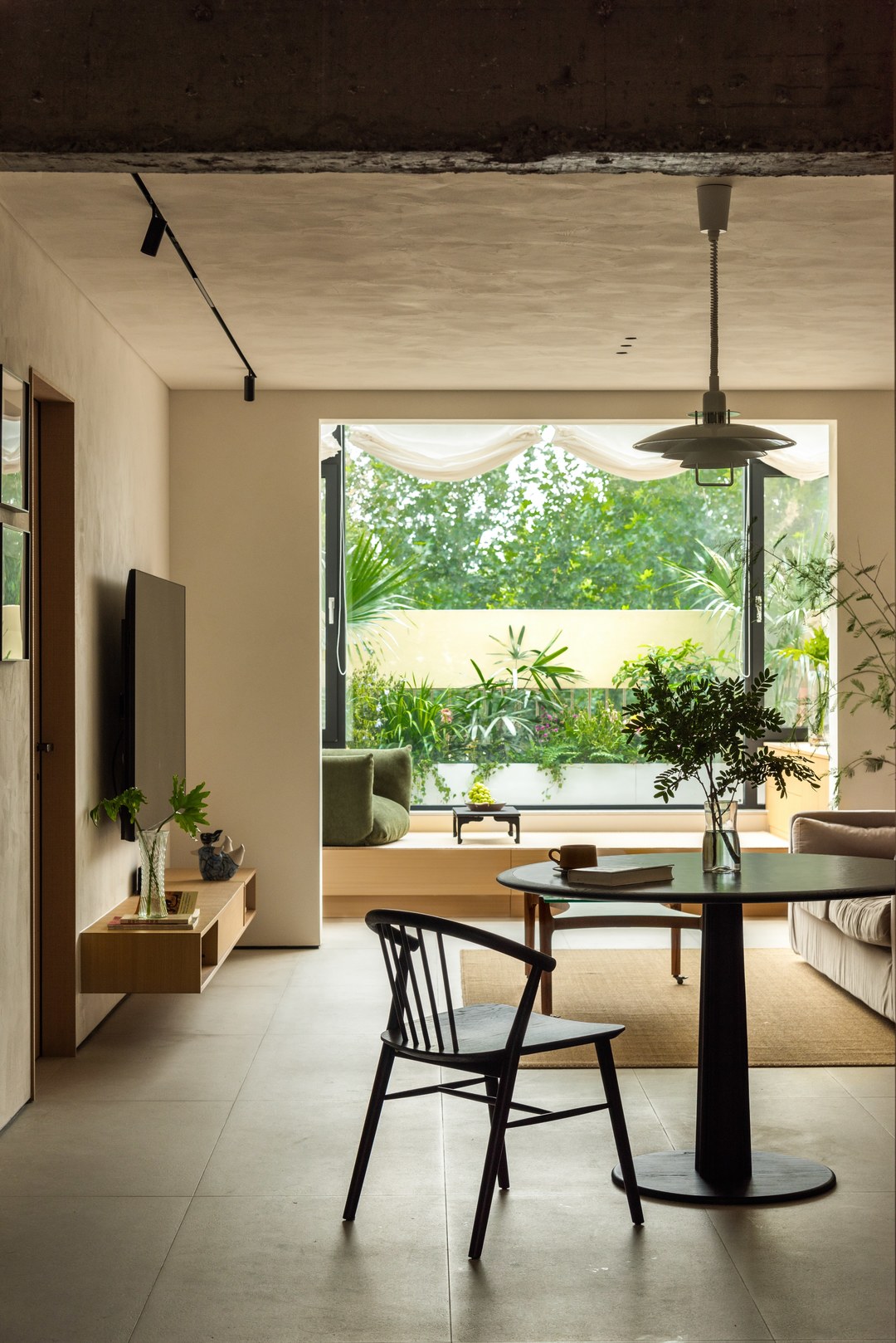 清晰的空间框架与材质逻辑构建出一个开放的容器,让生活轨迹、家具更替、植物生长,
