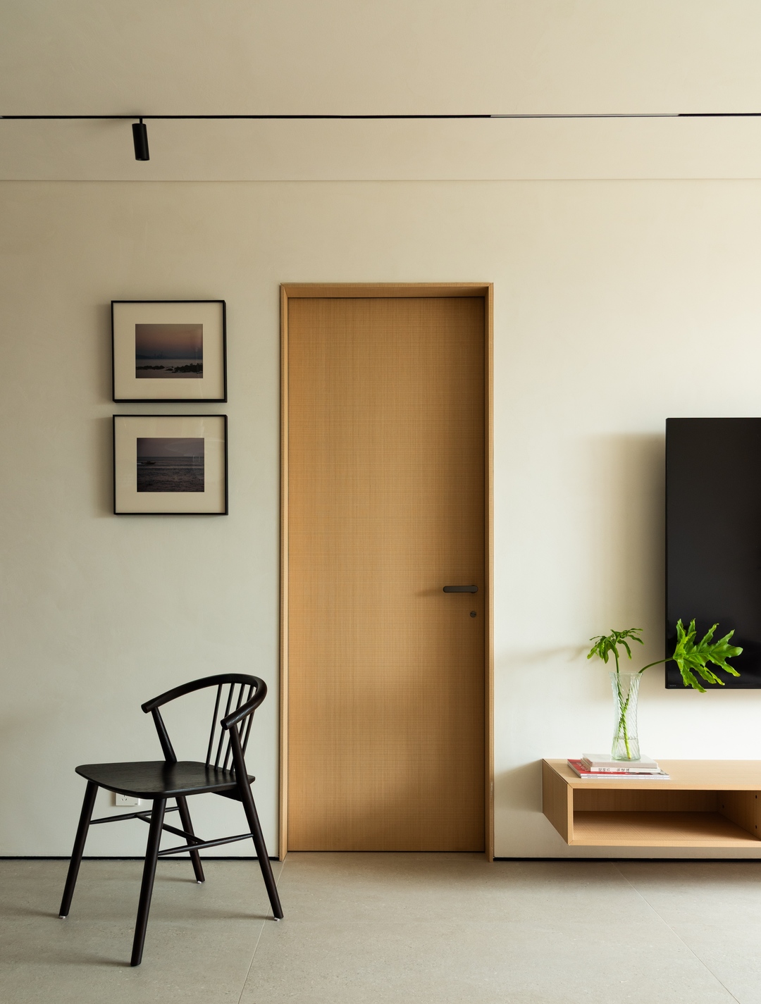 木作与织物:浅色锯齿木纹贯穿全屋,以温润质感平衡灰泥与混凝土的冷峻。