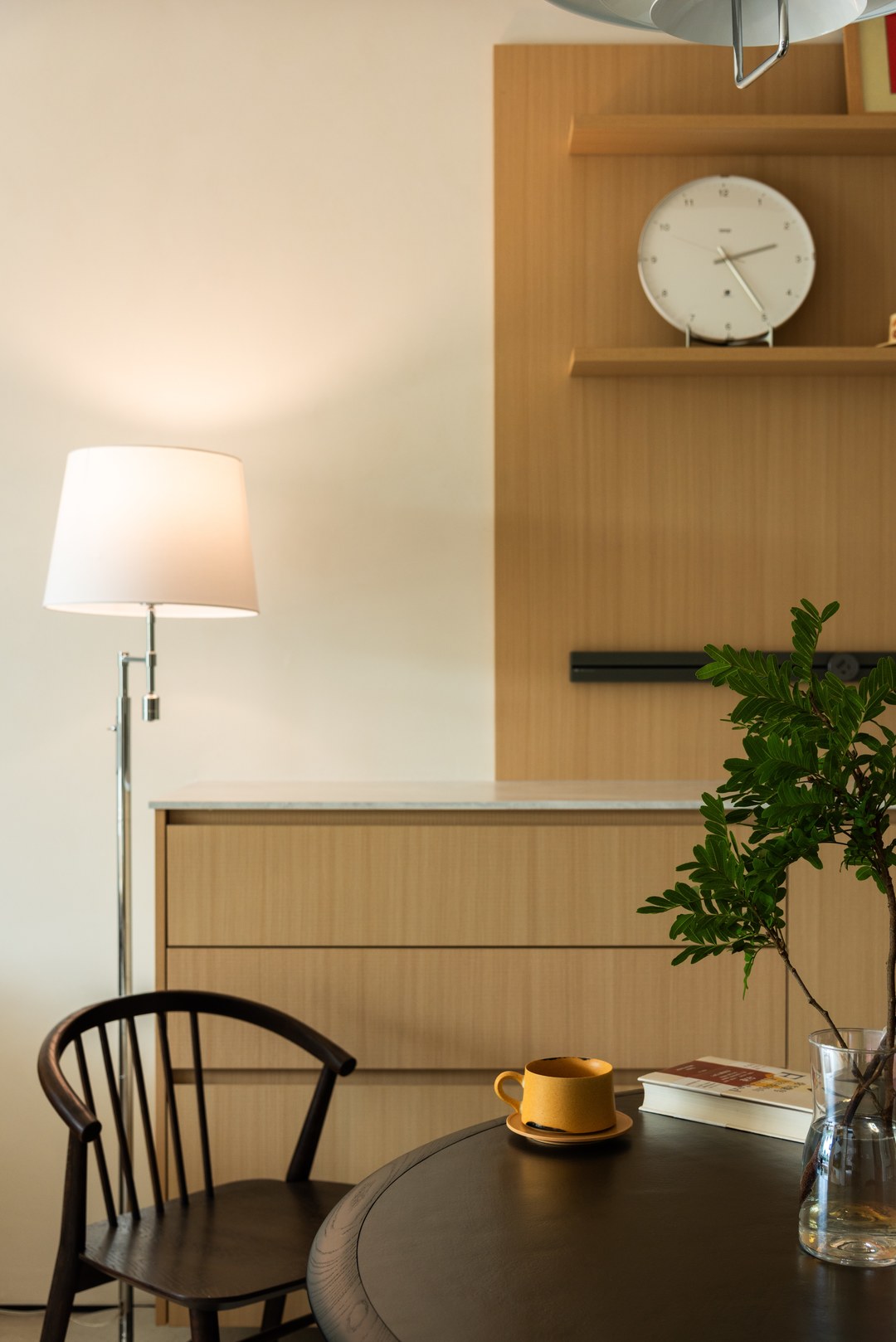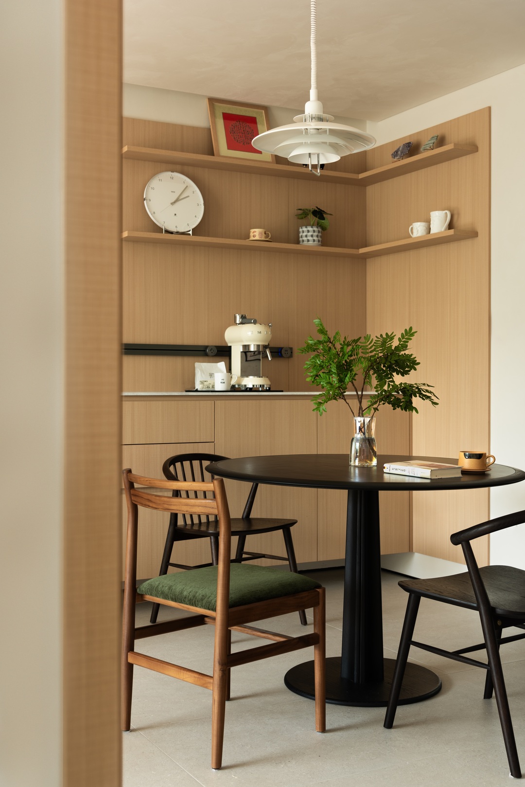 餐厅以圆桌营造聚合氛围,木质餐边柜兼具收纳与背景功能,吊灯的升降结构则回应日常的灵活性。