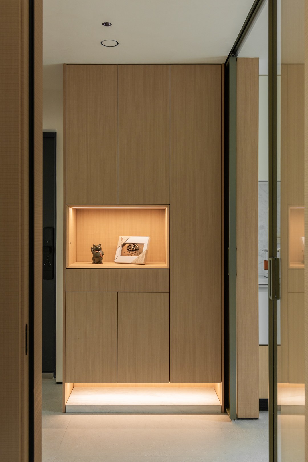 玄关鞋柜与岩板地台形成连贯的使用逻辑,引导“脱鞋—暂放—归位”的生活秩序。黑色木纹餐桌与玄关桌在视觉上形成呼应,使空间过渡更为完整。