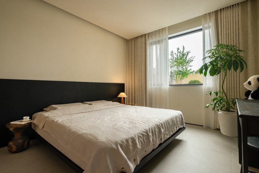 床头只放置一只云南老木墩子作为边几,呼应自然的质朴与厚重。卧室正对露台,四时景致成为精神延展。
