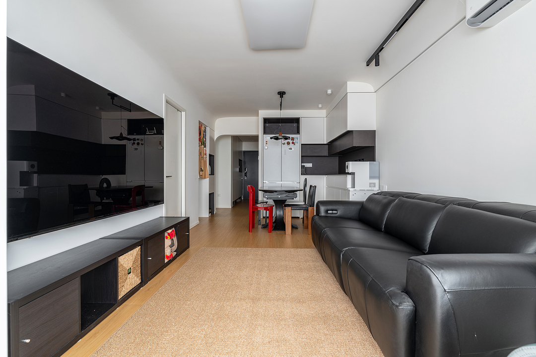 5.客厅与第三间房的隔断完全打开,做成一体式大横厅布局,提升通透性的同时,还弥补了采光的不足。