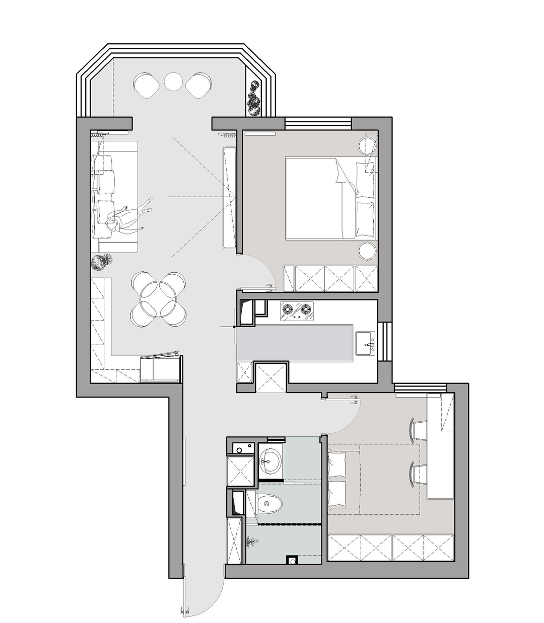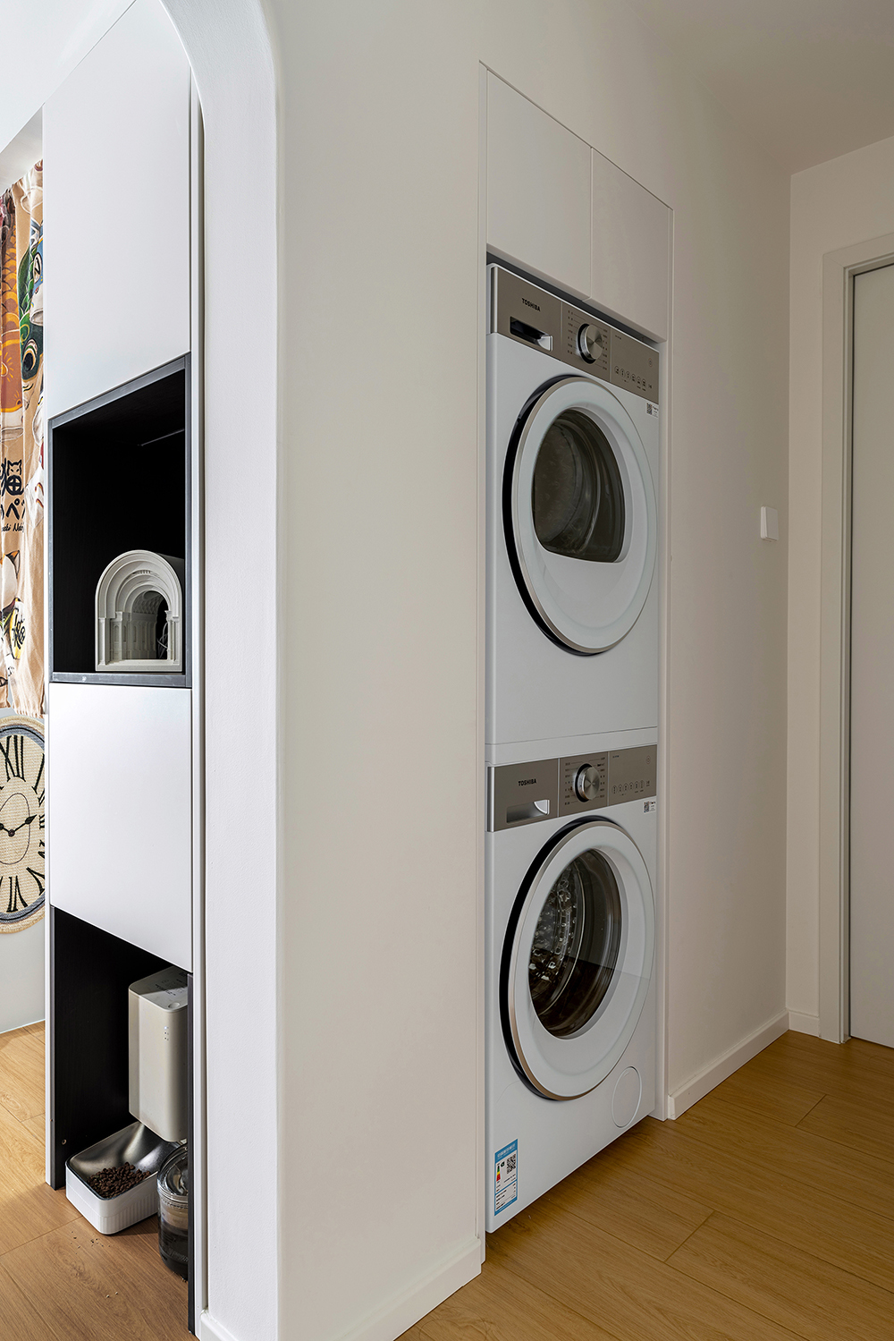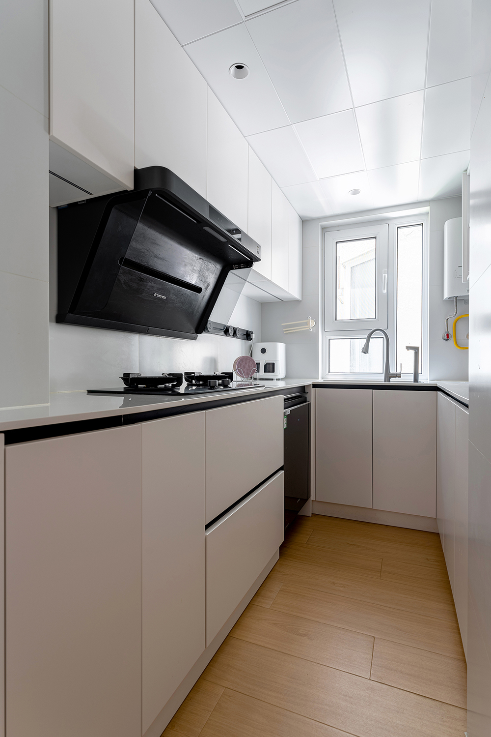 3.厨房调整洞口,原来的门洞嵌入洗衣机、烘干器。厨房内L型布局,保证充足储物和操作空间。