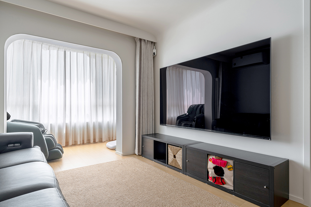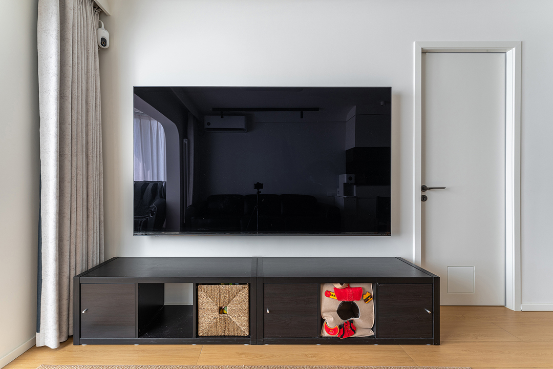 长条形的落地电视柜,提供了充足的储物空间,用于存放电子设备和媒体物品。编织框和猫洞,给两只小猫咪也留足了自己的隐私空间。