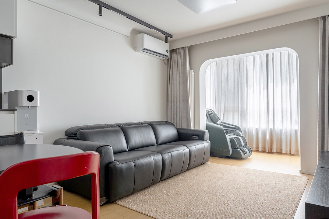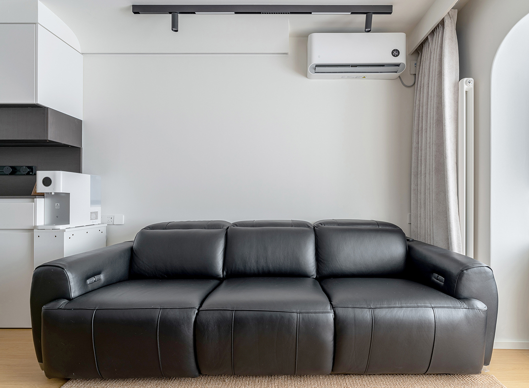 客厅轨道灯照射墙面,赋予空间留白干净的视觉感受。选择了舒适的黑色皮质沙发,不仅耐用且易于清洁。柔软的面包型小沙发,可坐可躺实在太舒服了~