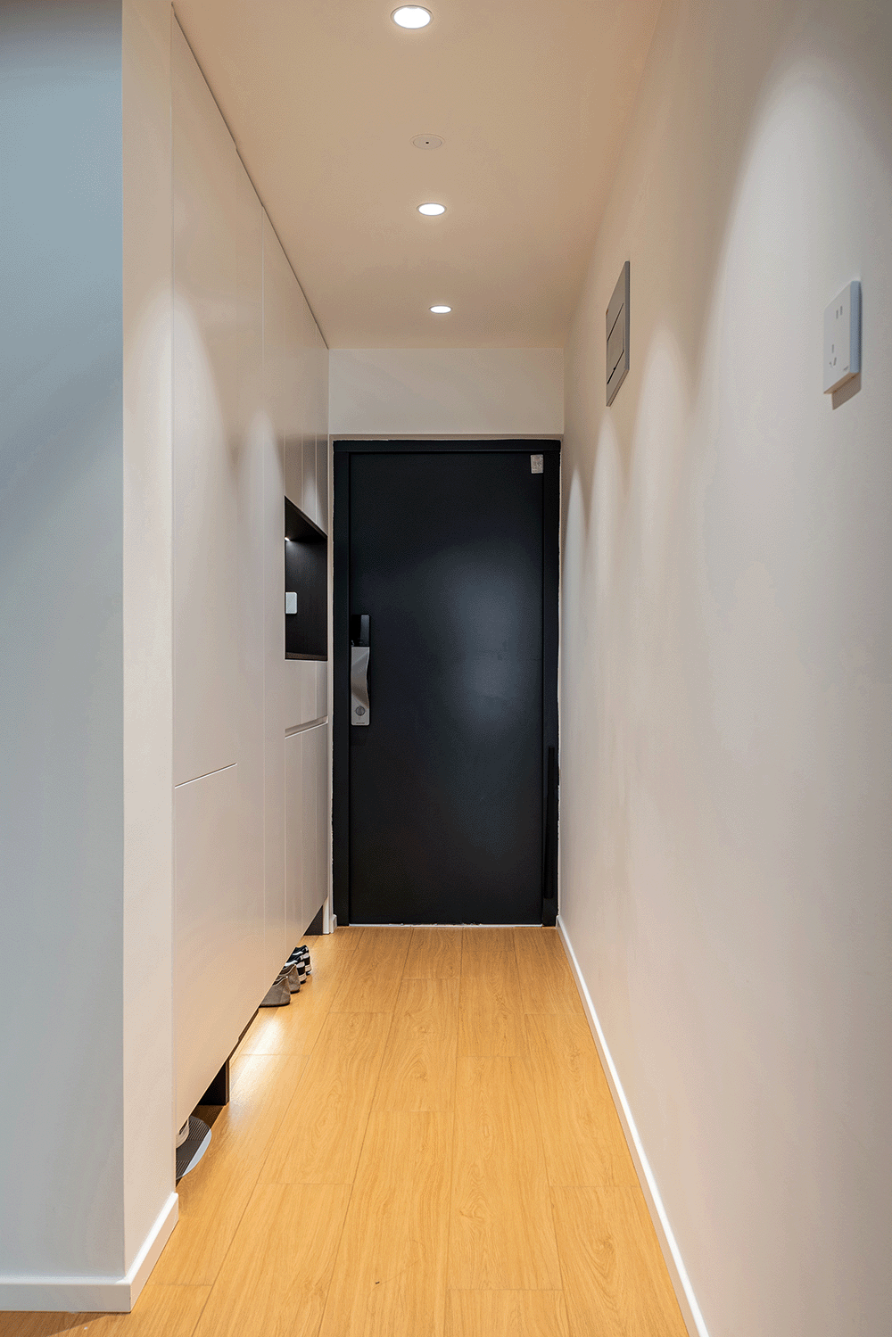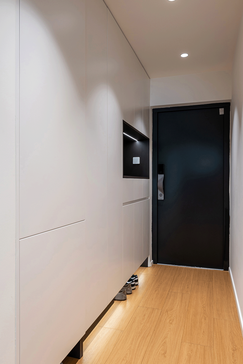 玄关区域安装了嵌入式顶灯,提供均匀的照明,确保在进出时有足够的光线。