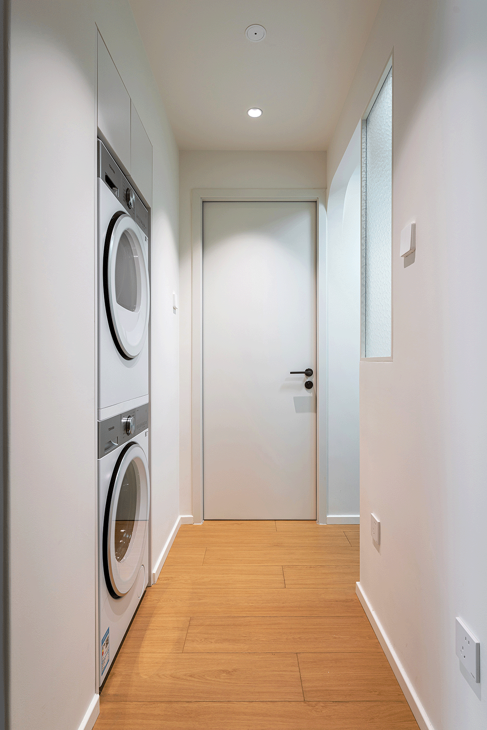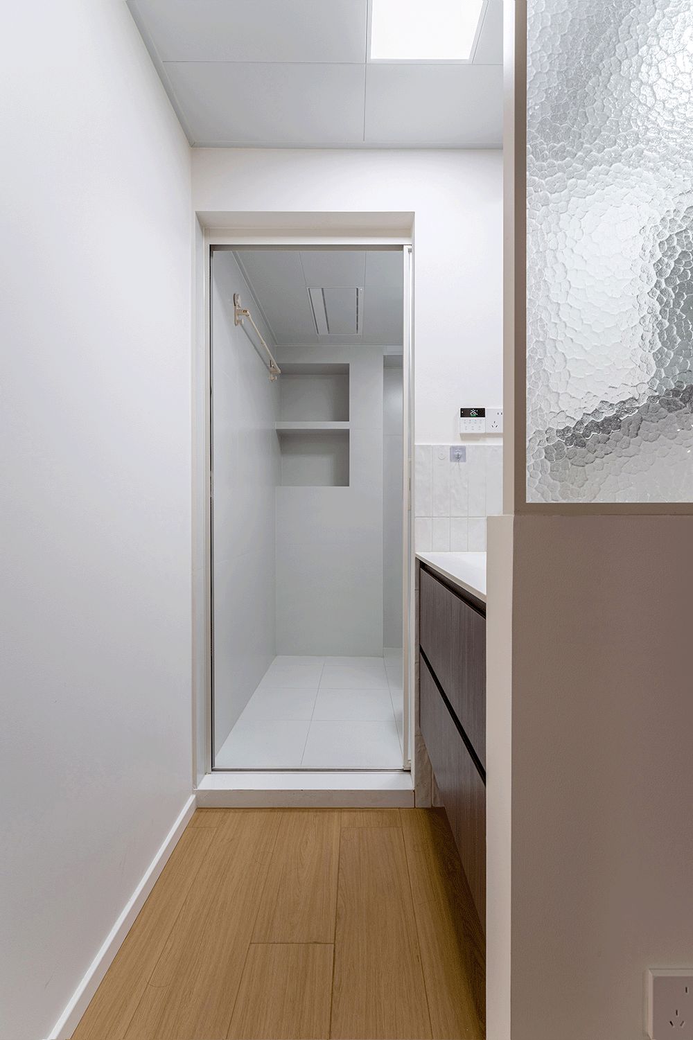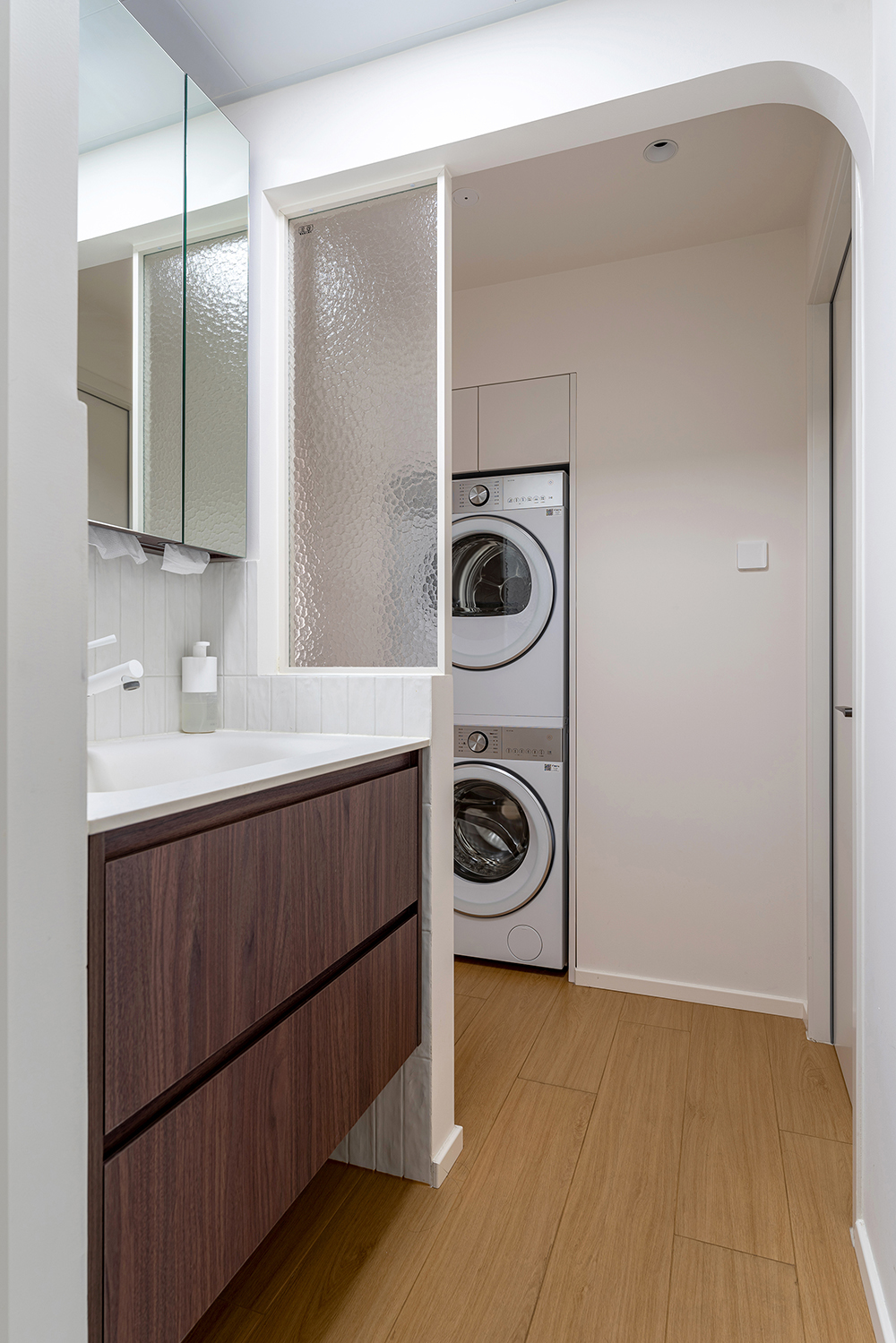 卫生间干区设计了弧形垭口,为浴室和过道洗衣区之间提供了一个柔和的过渡。打破了传统直角的硬朗感,增加了空间的流畅和舒适度。