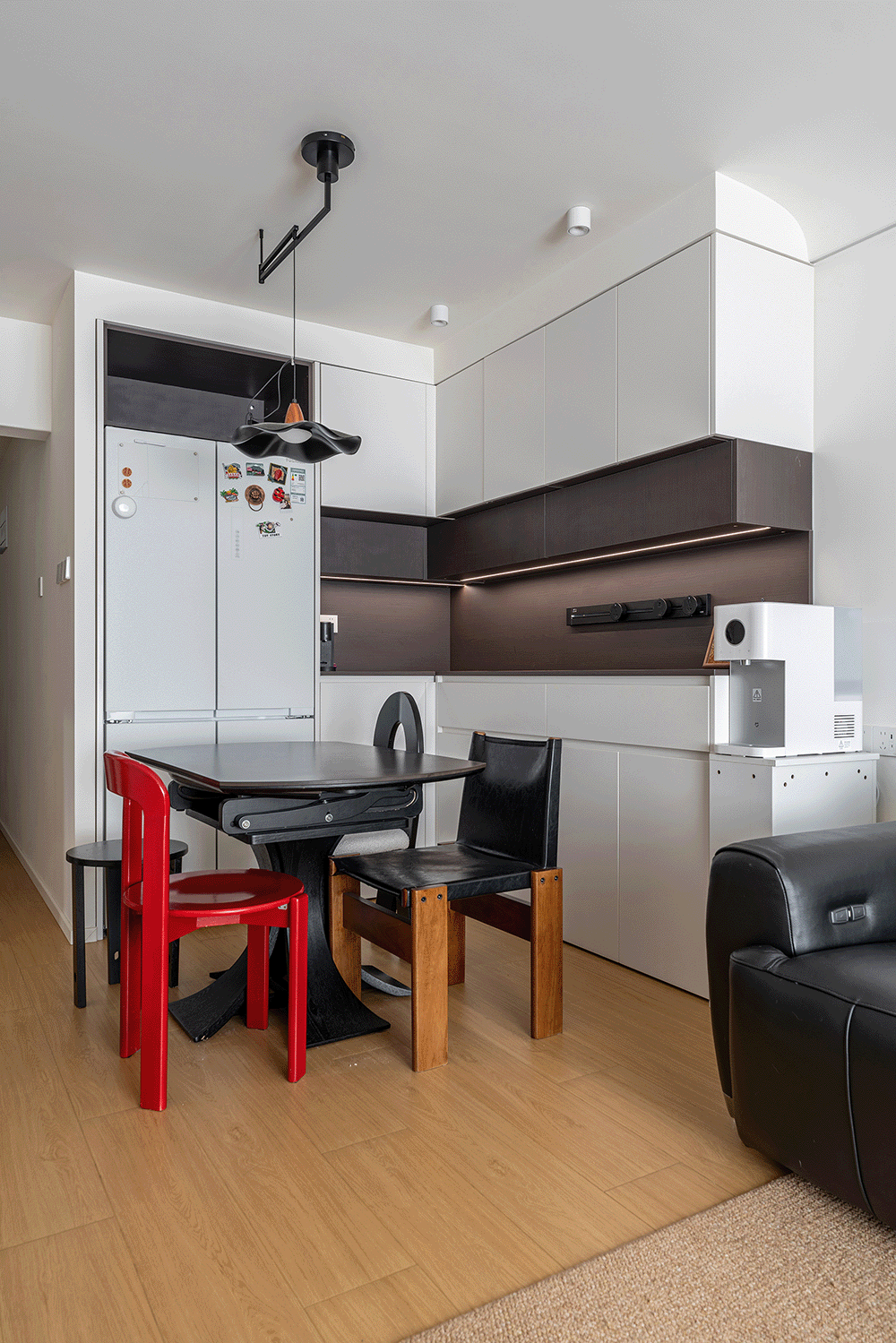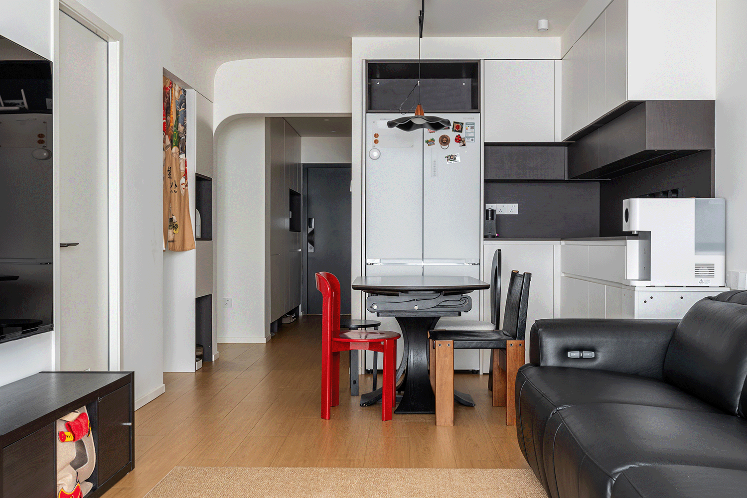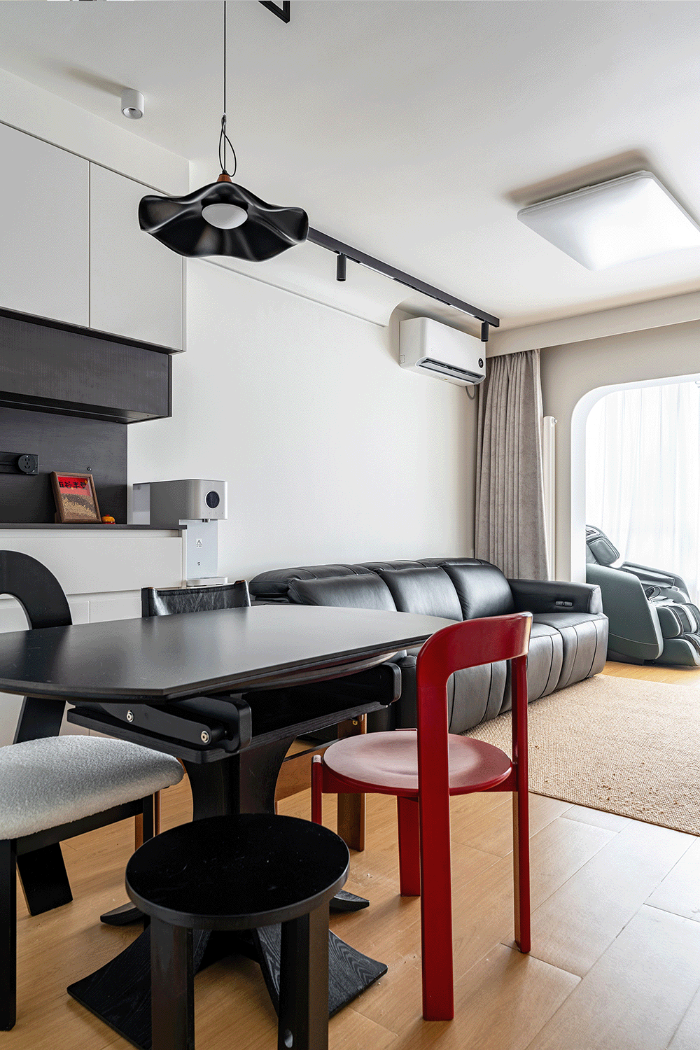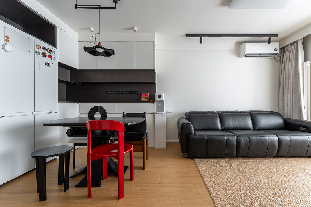 边柜总长1.8m,不仅提供了充足的储物空间,用于存放餐具、酒类和食品等。吊柜和底柜之间还设计了开放的操作空间,也能用于展示装饰品或常用物品,增加了空间的实用性和美观性。餐厅区域把冰箱嵌入了高柜中,增加西厨的功能分担性。黑白灰的配色搭配红色椅子作为点缀,形成了和谐的视觉效果。