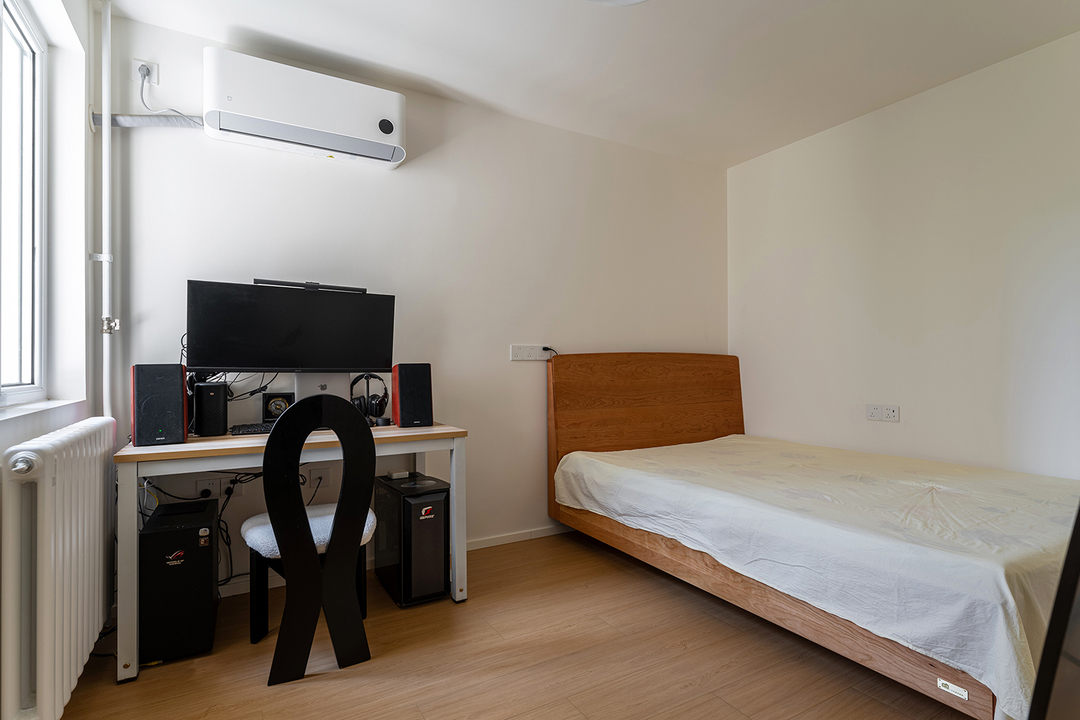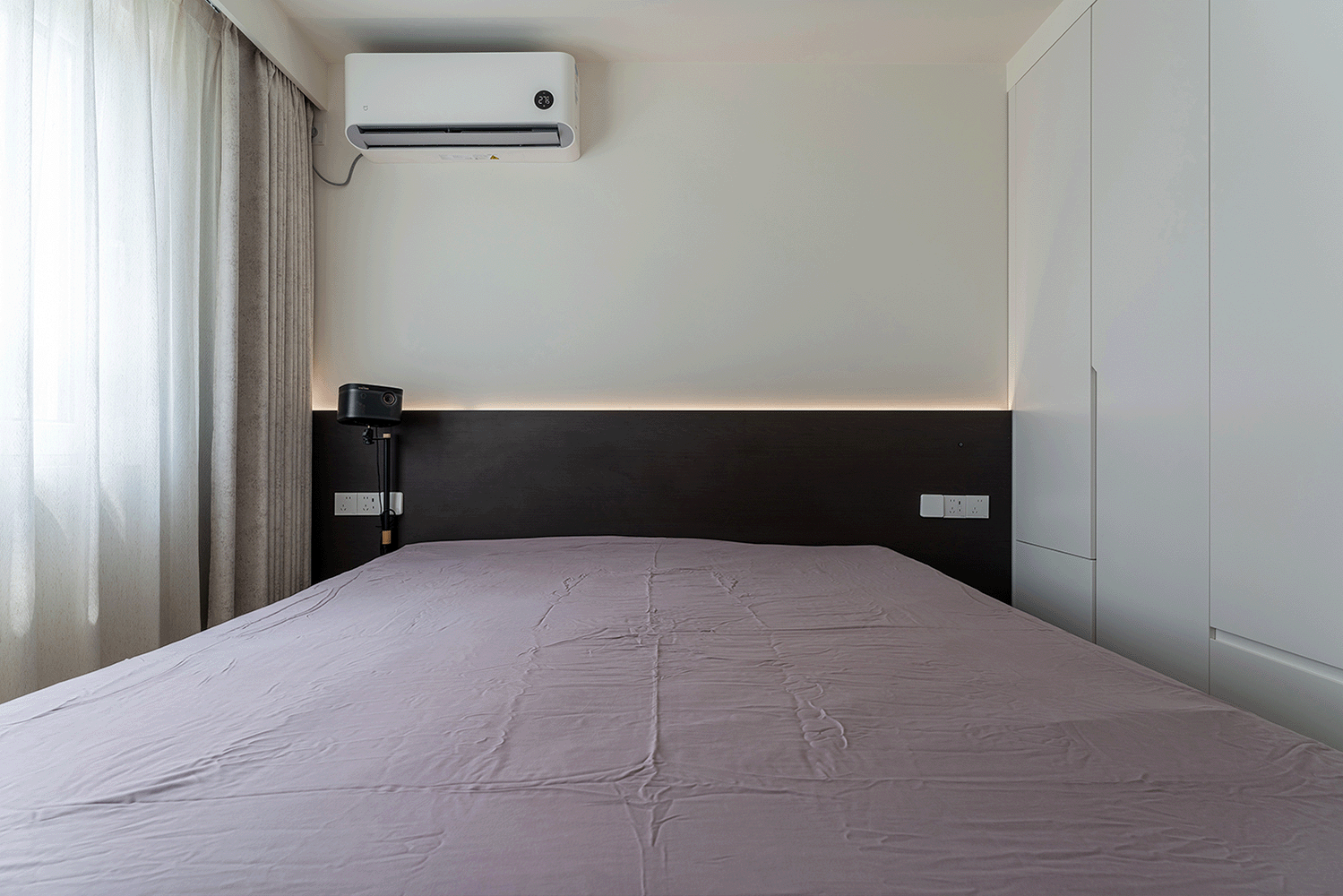 在本次主卧设计中,为了营造一个宁静、舒适的睡眠环境。床头背板采用了高品质的深胡桃木,沉稳深色调,与墙面的浅色形成对比,视觉上营造出一种稳定和安静的氛围,增加了空间的层次感。