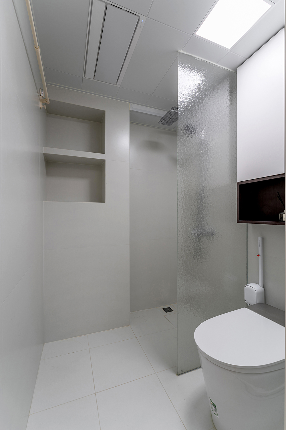 卫生间墙面设计了壁龛 ,提供了充足的储物空间,用来存放洗浴用品和清洁用品,随手可取方便灵活。无边框的玻璃隔断,将淋浴区与马桶区域分隔开来,确保了淋浴时水花不会溅到马桶区域,保持了卫生间的干燥,减少卫生死角。