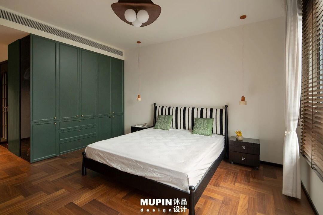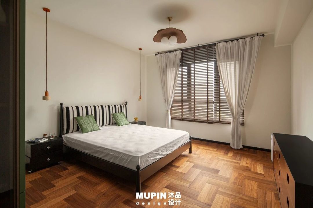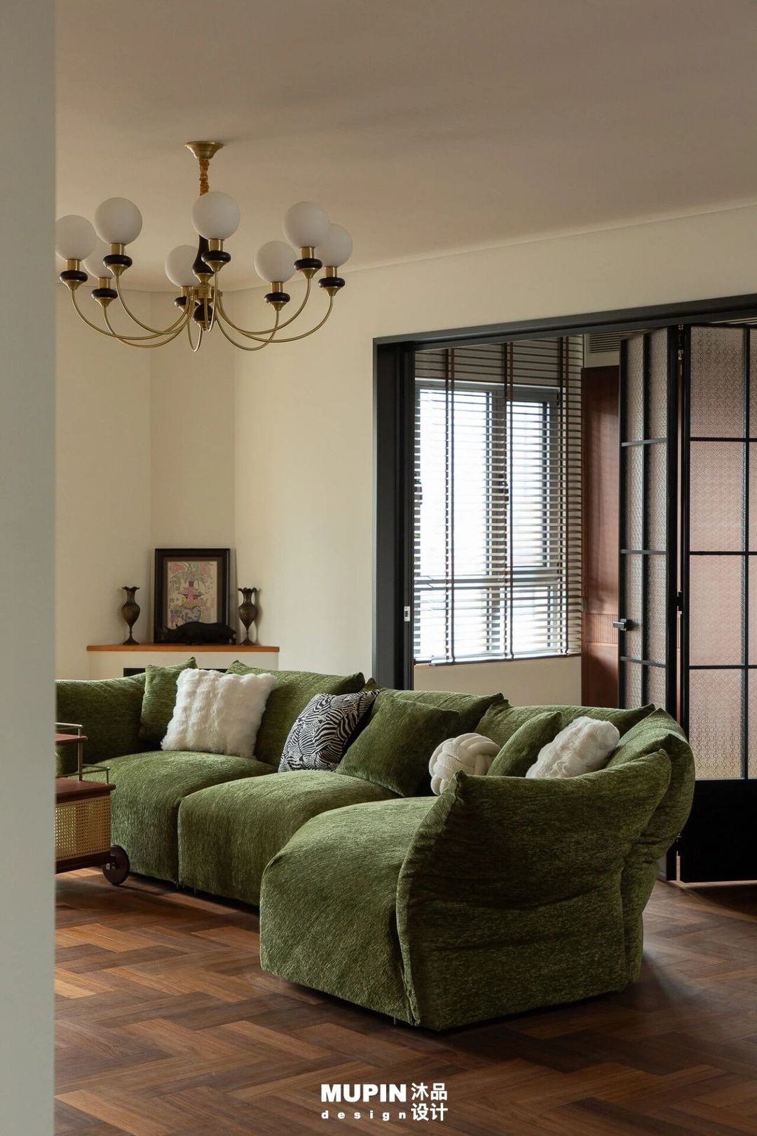 黑色边框玻璃移门与百叶窗的组合,则巧妙调控自然光的流入,使室内光影随时间流转呈现出动态的戏剧性效果。