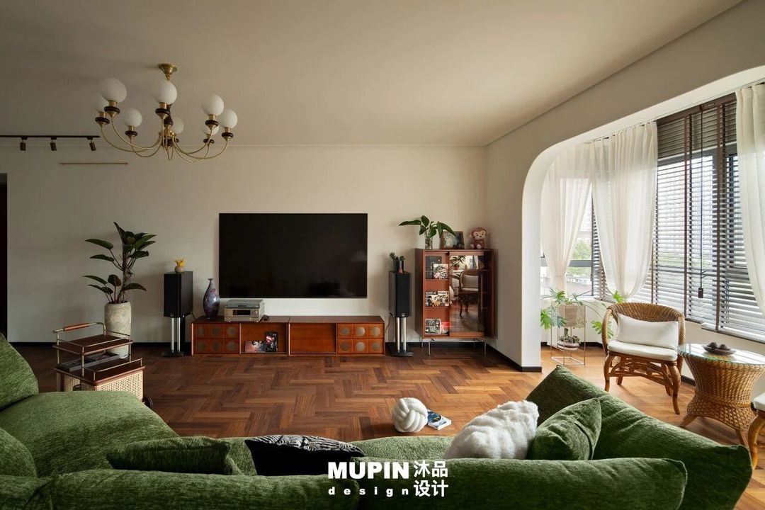 人字形拼花木地板以深邃的色调延伸,不仅强化了空间的纵深感,其几何韵律更与家具的柔和曲线形成精妙对话。