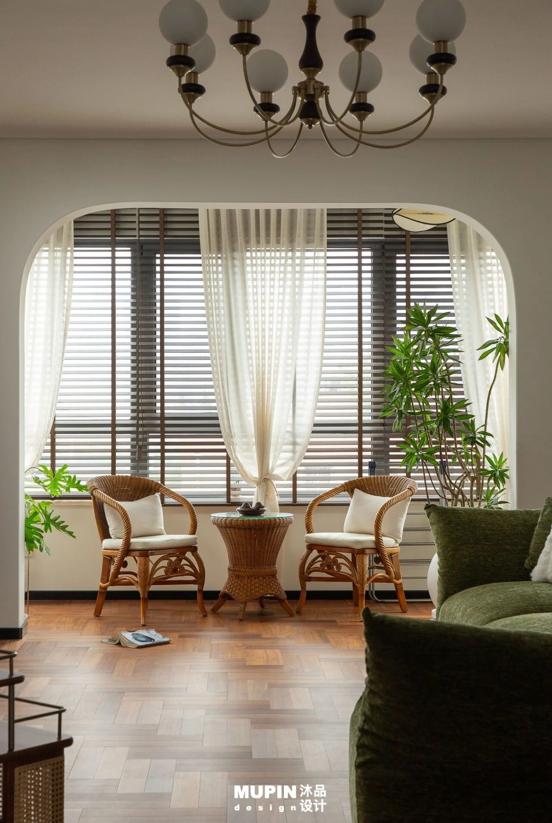 拱形门洞作为经典建筑语汇,不仅柔化了空间过渡,更将窗边的藤编休闲角落框定为一幅静物画,实现了视觉的延伸与功能的区隔,丰富视觉层次。