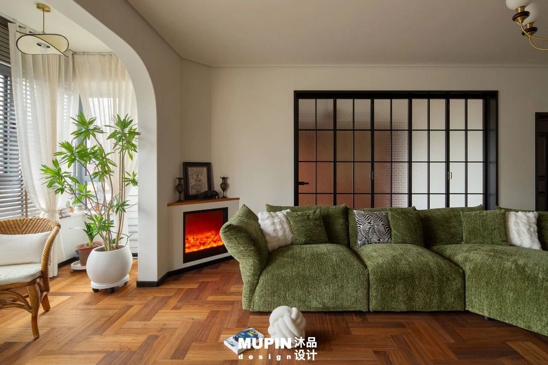 仿真壁炉的暖光、葱郁绿植与散落抱枕,共同注入闲适的生活气息,于柔和光线下,营造出一方温馨惬意且富有格调的治愈居所。