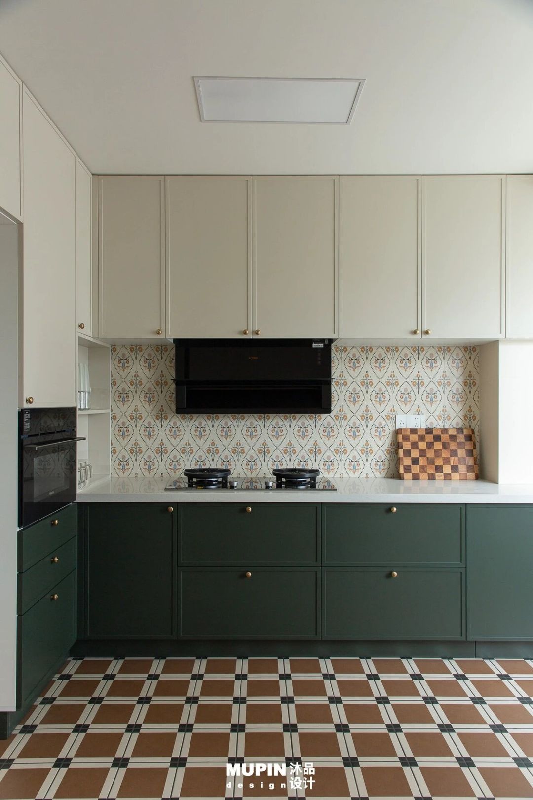 厨房的纯白吊柜与金色拉手勾勒出轻盈的精致感,下方沉稳的墨绿色地柜则注入深邃的奢华底蕴,二者通过洁净的浅色台面达成视觉平衡。