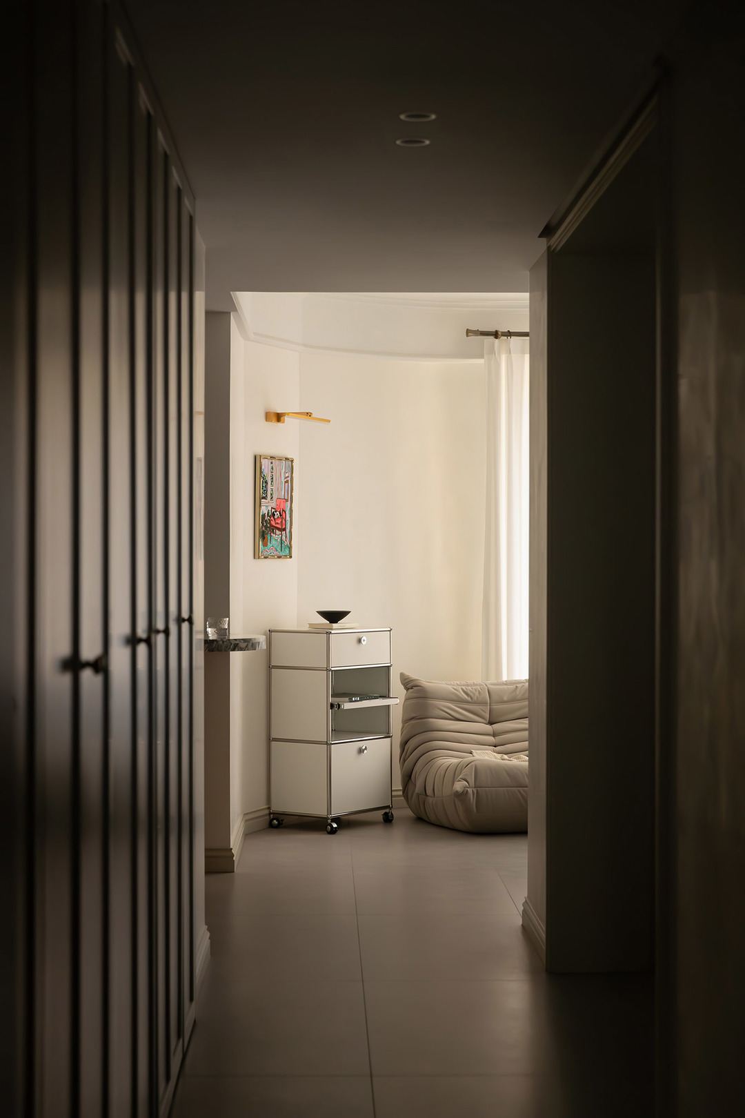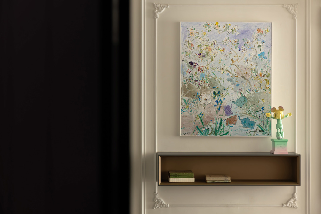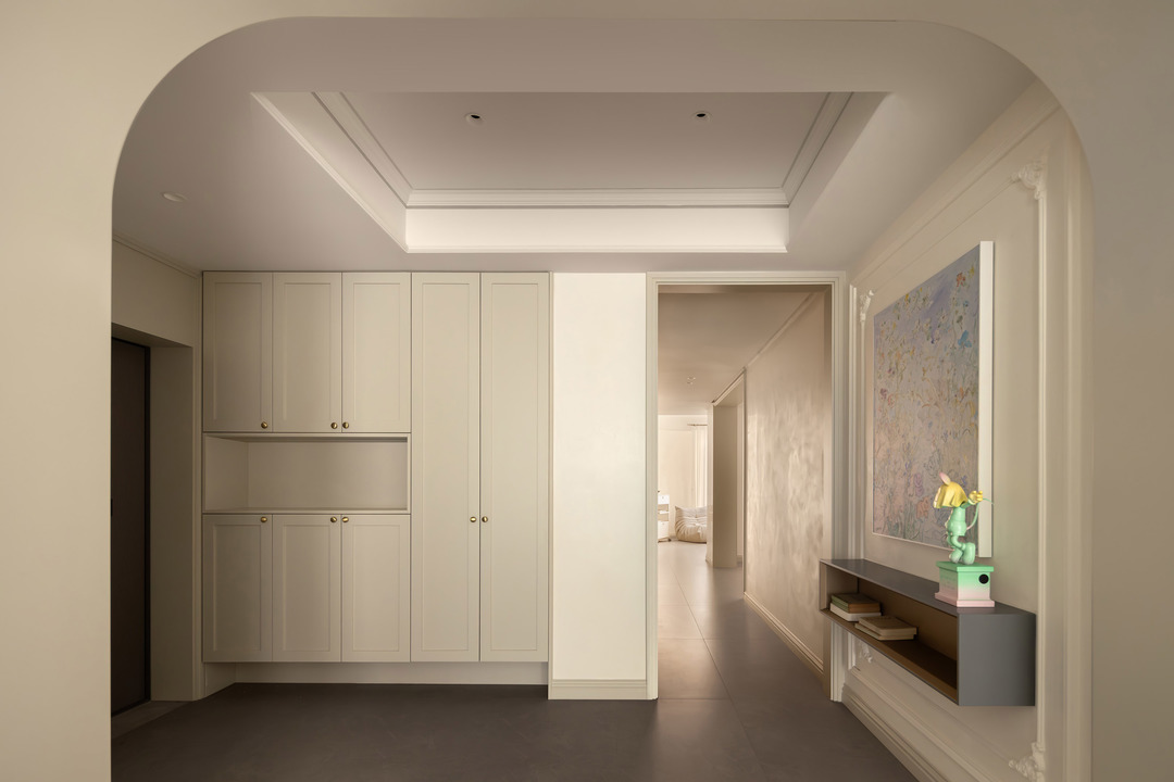 改造前入户无玄关,经由世界归家,没有仪式感,自然削弱了“归”之于人的特殊意义。设计师在玄关造景,简单的法式线条,突显出眼前的画卷,往前走,即是缤纷天地的开启,幸福生活的旖旎想象。