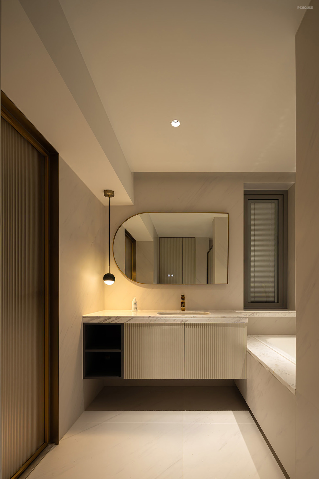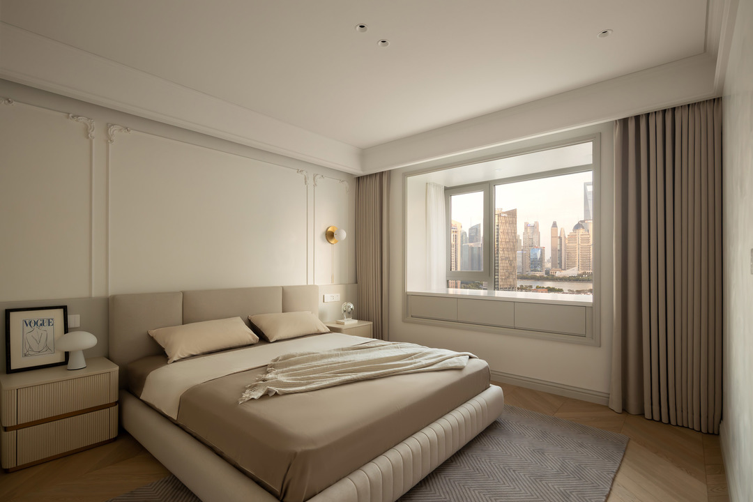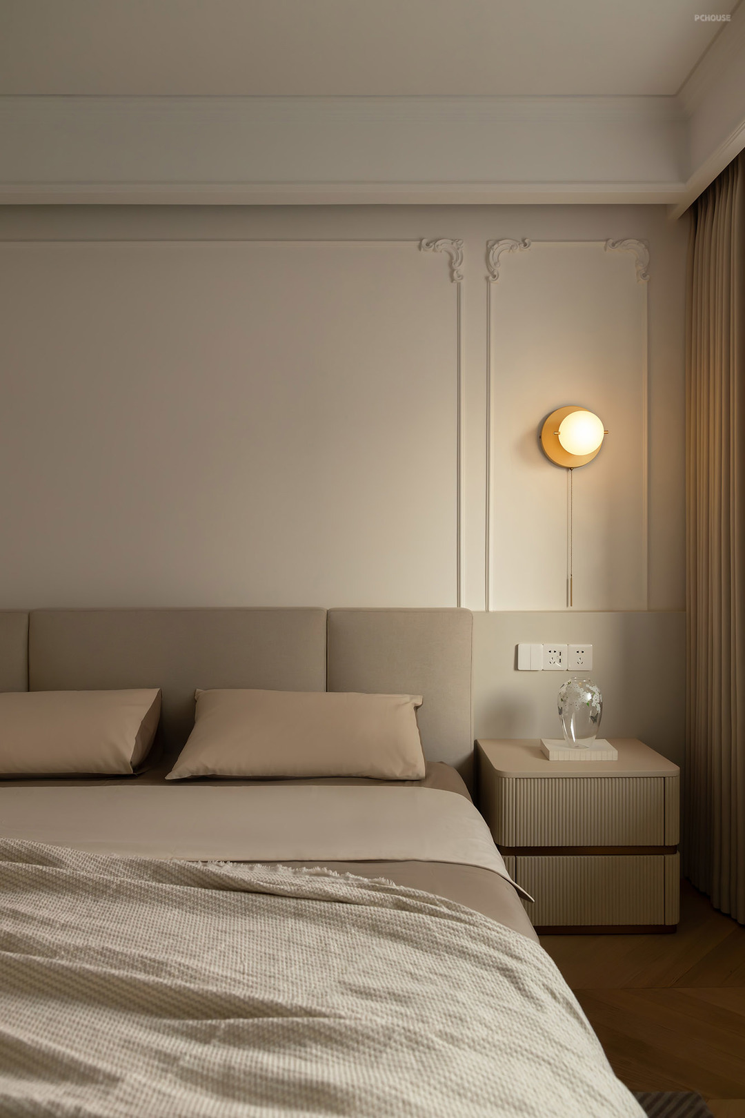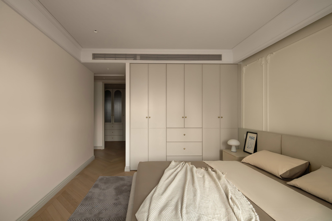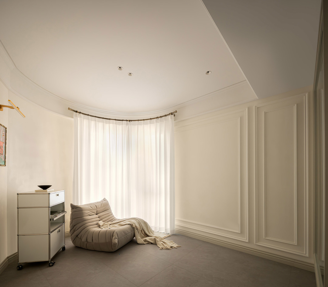 对收纳的优化,是整个家改造的重点,同时考虑到了主人的观影需求。电视墙被设计为整面的收纳墙,能放置一家人半数的生活杂物;搭配同色系帘幕,避免凌乱感之余,又为空间注入和谐统一的视觉节奏。
