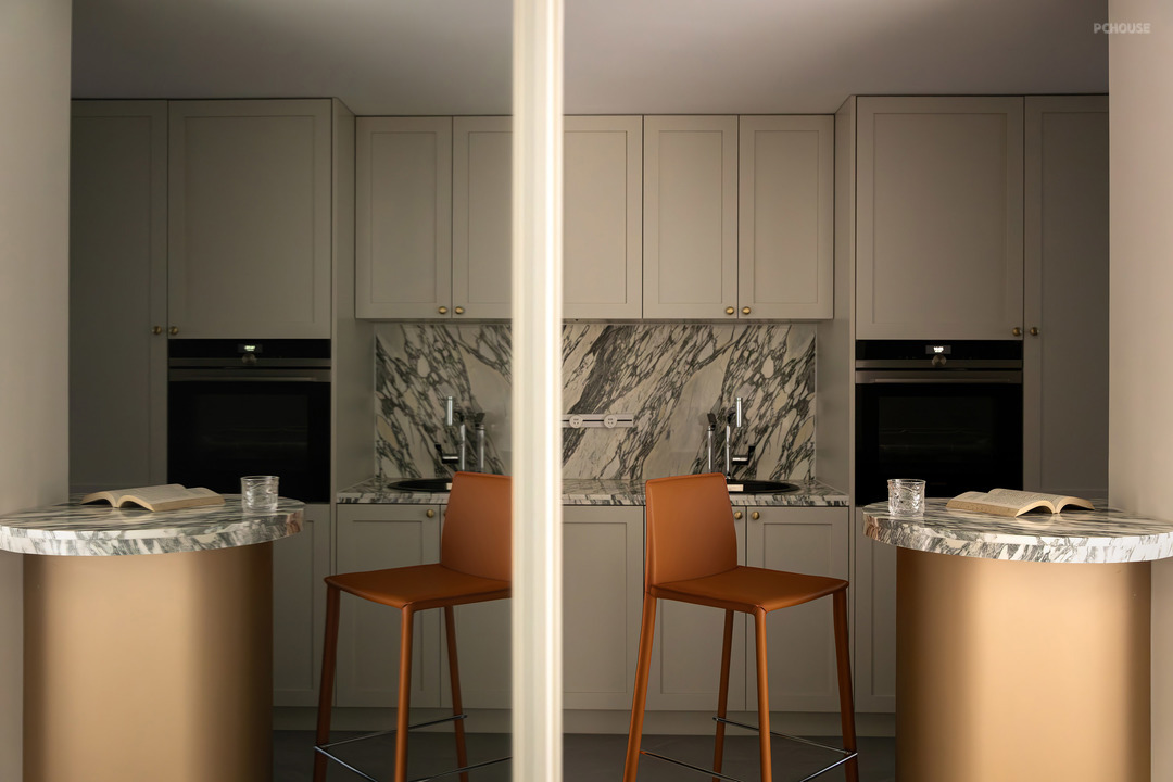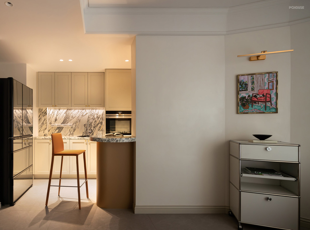 旧有的厨房缺少延展空间,无法满足主人喝咖啡、做料理的需求。改造后,原本堆放杂物的小阳台,“变身”为中厨,以适应不同的使用场景。整个餐厨空间,功能完善,家庭成员们在区域间交织互动,归属感和幸福感将他们连接在一起,演绎当代都市生活的美好图景。