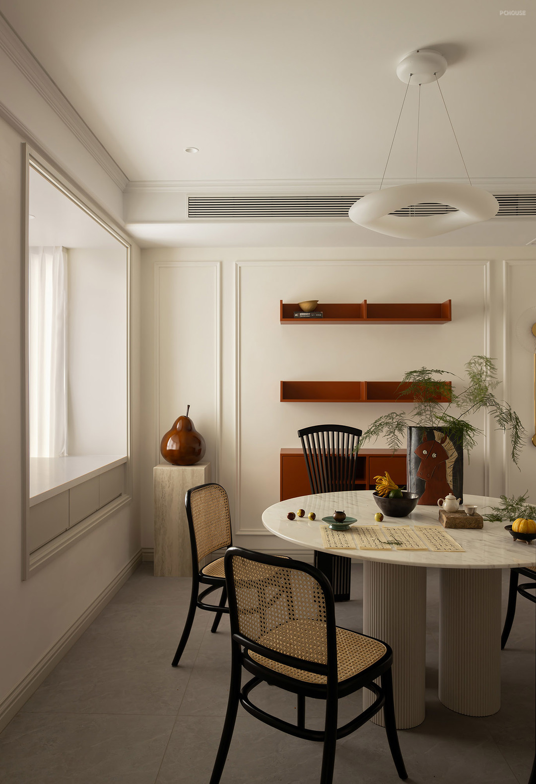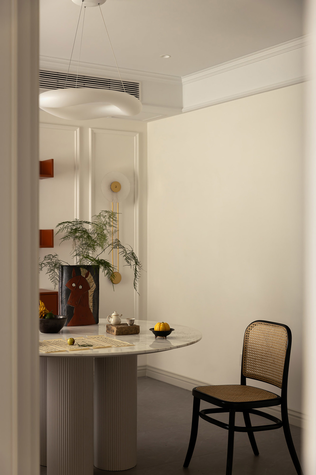 将原来闲置的房间打开,改为餐厅,宽阔的空间极大提升了使用体验,承载得下更多的家庭欢聚的片段。留白的框架下,设计师填充以颇具特色的装饰单品,亮眼的形与色,烘托出轻松不拘的空间格调。