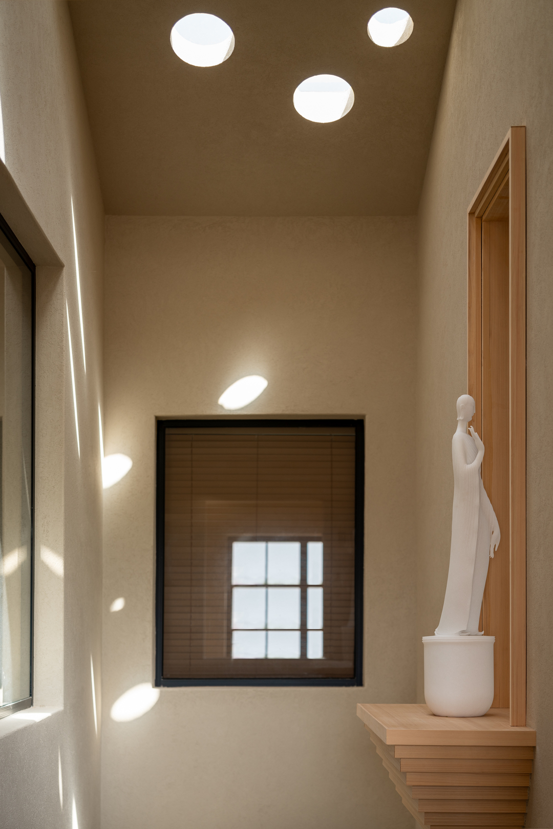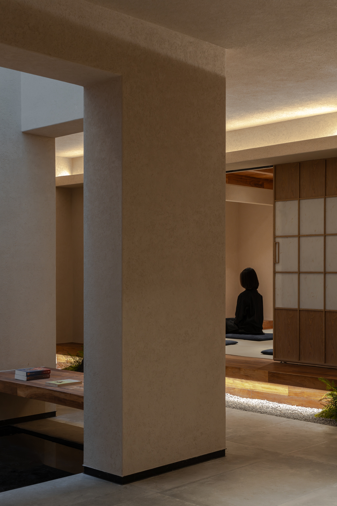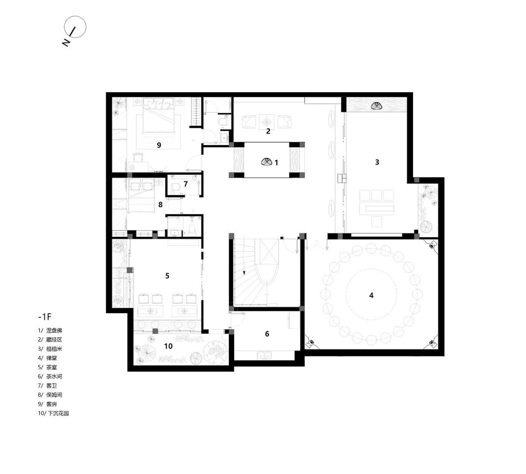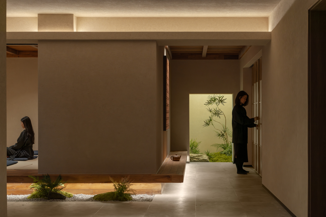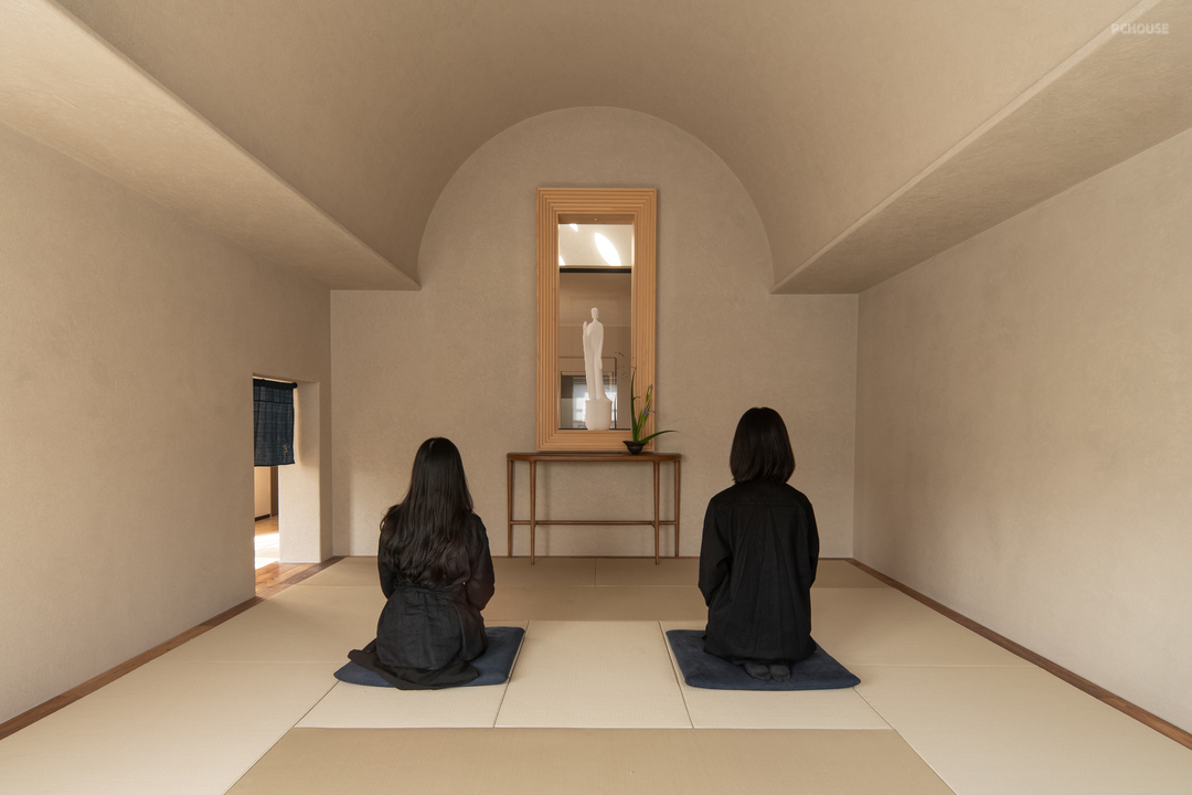 设计摒弃繁复装饰,大量选用硅藻泥、水洗石与实木地板等天然材料,构建出一个素净、包容且隔而不断的空间基底。通过重构电梯井,引入贯穿三层的天井,使自然光成为空间流转的灵魂。地下一层突破了该类型空间常规的储物功能,转化为冥想与独处的秘密花园;而耗费1500米麻绳手工缠绕的穹顶,则成为具象化的修行隐喻。