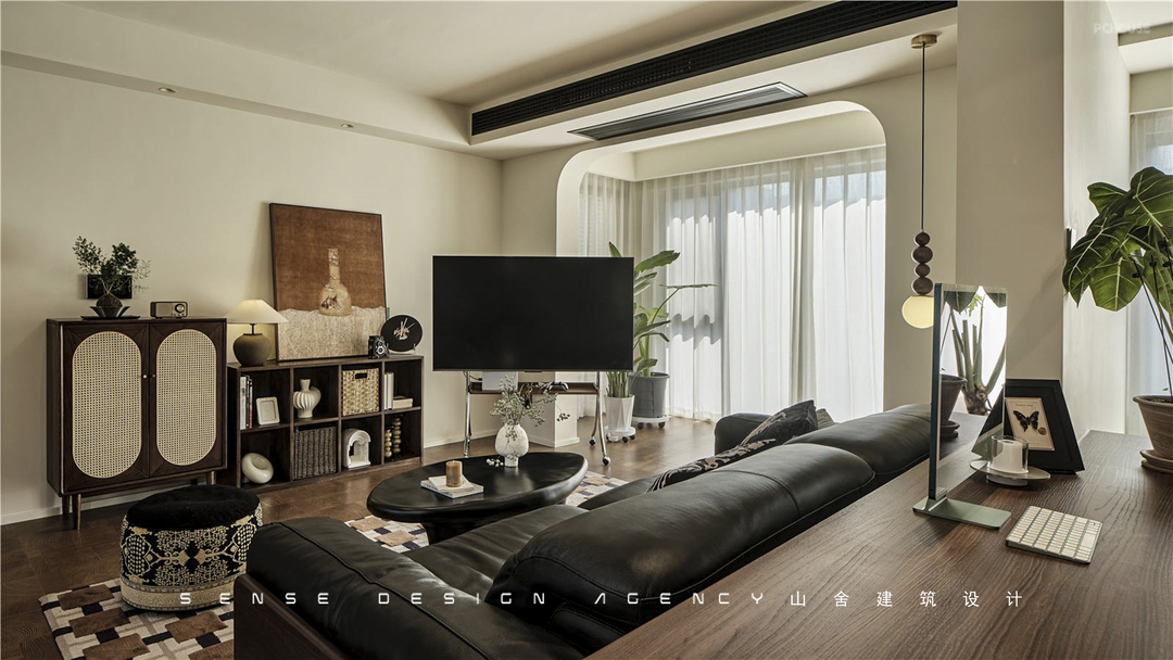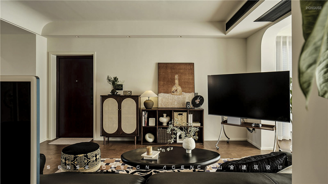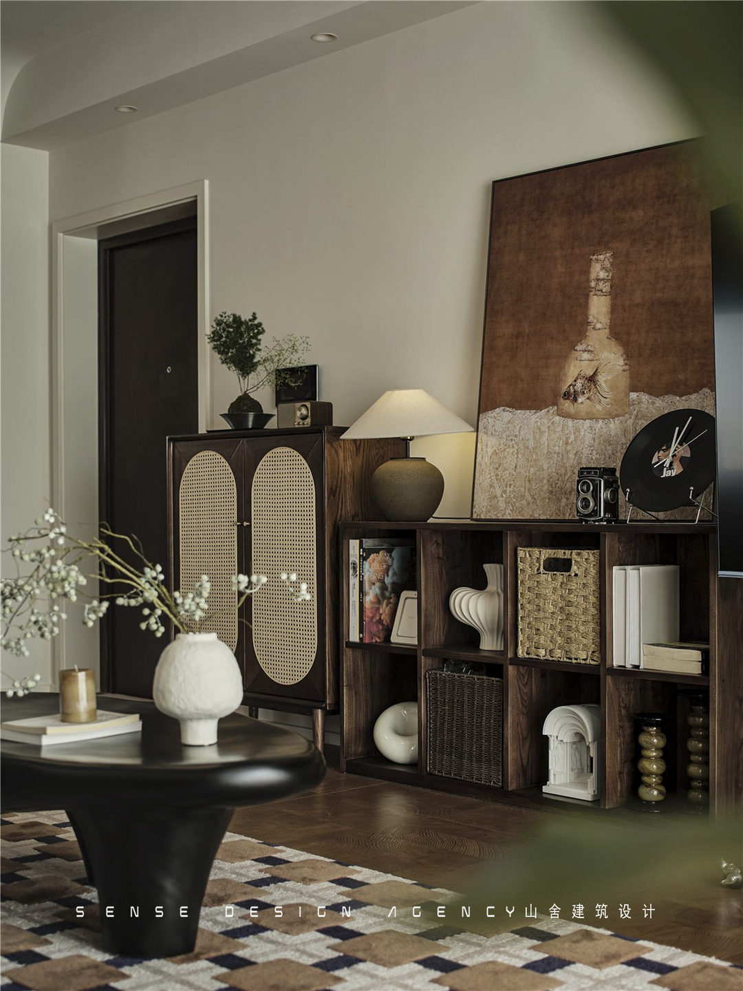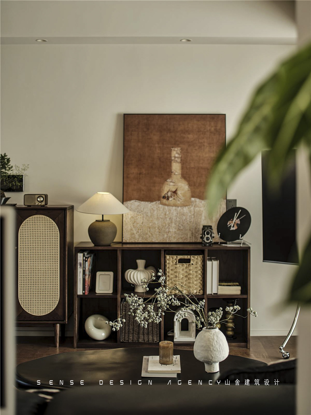 去电视墙设计: 摒弃了固定的电视背景墙,选用实木中古开放格矮柜与藤编柜进行组合搭配,既满足了收纳与展示需求,又通过材质的碰撞(木材的沉稳与藤编的自然)奠定了空间的中古混搭基调。可自由移动的电视架,赋予了空间极高的灵活性,让客厅可以根据不同场景(会客、阅读、运动)自由切换模式。