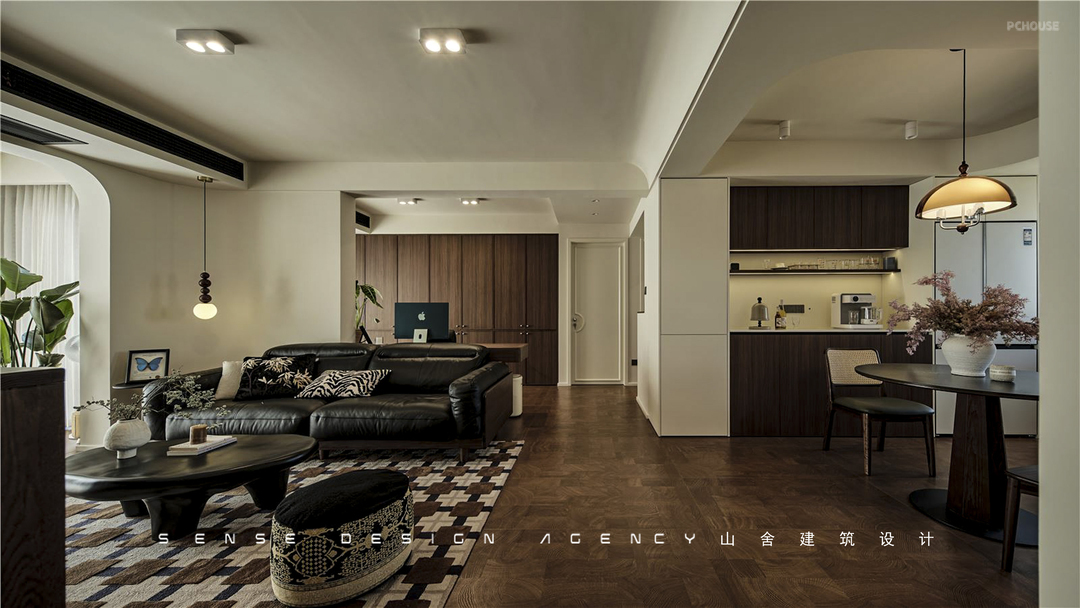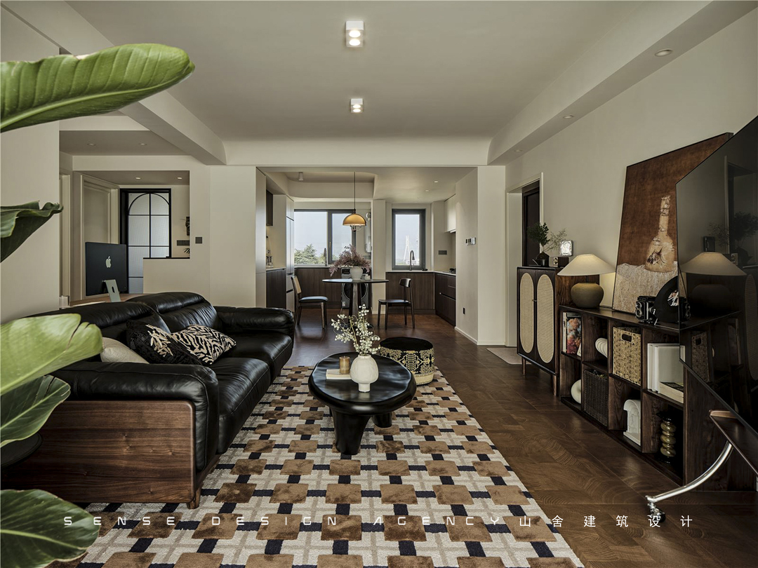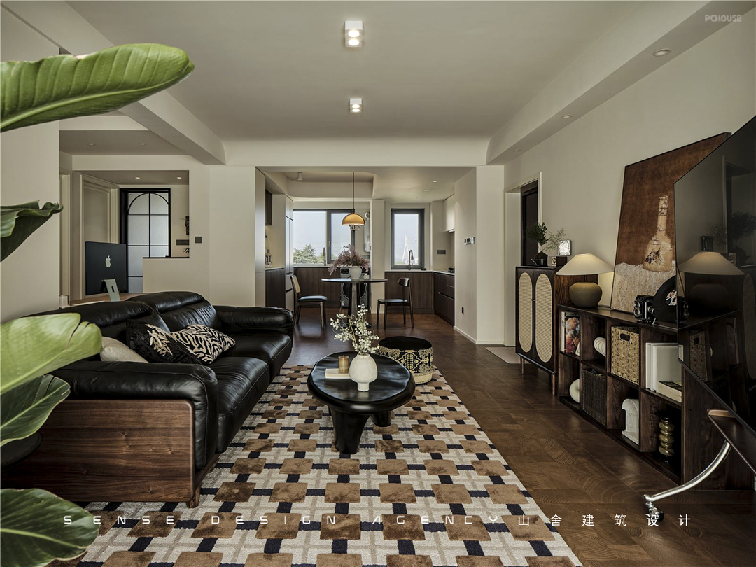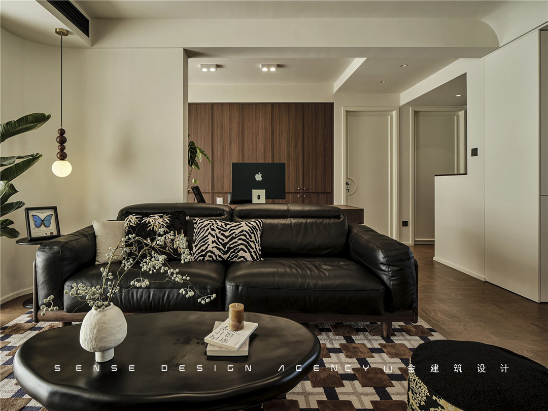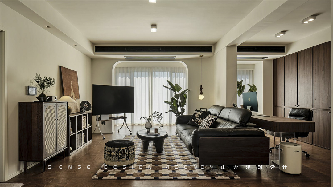 家具与氛围营造: 一款经典的黑色皮质沙发与复古格子地毯锚定了客厅的视觉重心,传递出低调而复古的质感。沙发背后,我们以一张悬浮式书桌作为客厅与书房的功能分界。此设计精妙之处在于,它划分了功能区域,却未阻断视觉的连贯性,保持了空间的整体性与开阔感。