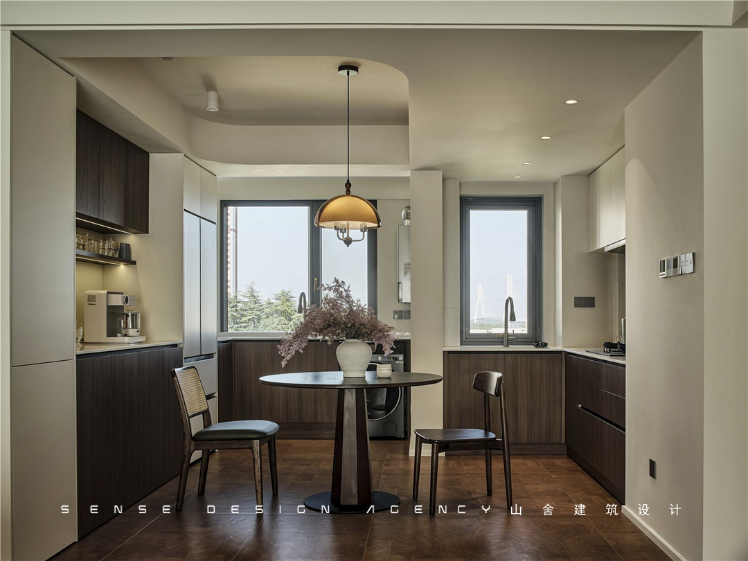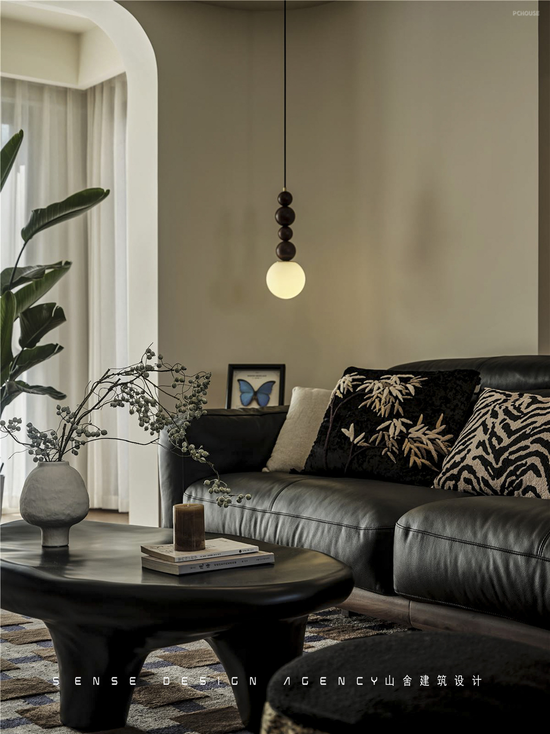 以餐桌为核心: 一张黑色圆形餐桌成为本空间的绝对主角,其流畅的造型与深邃的色彩,凝聚了视觉焦点。上方搭配一盏复古吊灯,营造出温馨愉悦的用餐氛围。