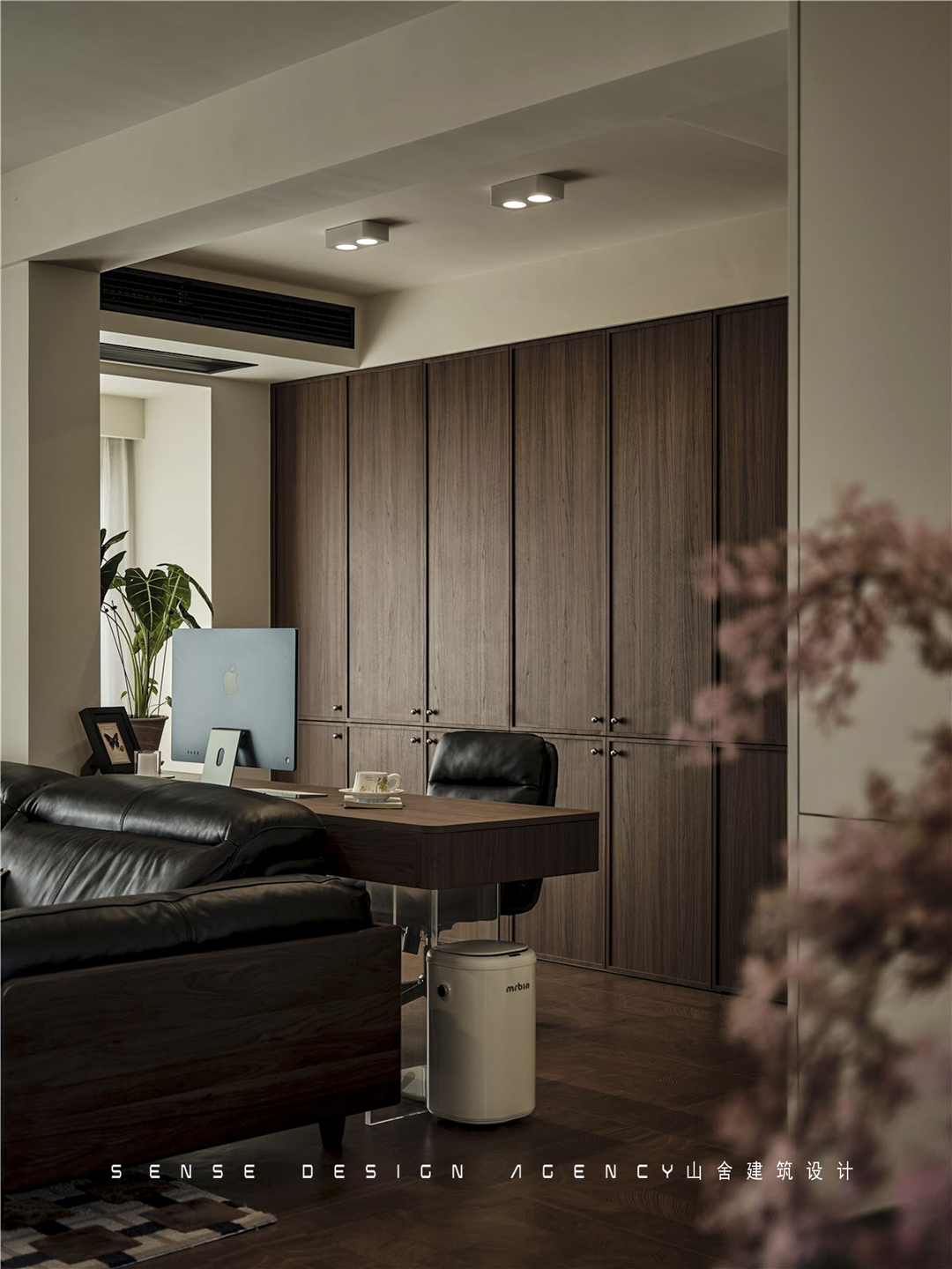 满墙系统收纳柜: 整面墙采用胡桃木色定制收纳柜,强大的储物能力将书籍、文件、杂物完美隐藏,保证了空间的整洁有序。深胡桃木色的运用,与客厅的浅色调形成对比,成为空间里一道沉稳而富有质感的背景,仿佛一个巨大的收藏盒,承载着知识与记忆。
