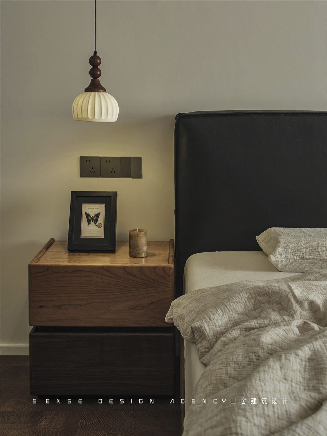 色彩与灯光: 空间以浅色为基底,营造宁静放松的氛围。胡桃木色的化妆台与黑色床铺软装作为点缀,沉稳而高级。照明上,采用温暖的主灯与床头小吊灯相结合的方式,提供整体照明的同时,也能满足睡前阅读等局部照明需求,营造出温馨且富有层次的灯光环境。