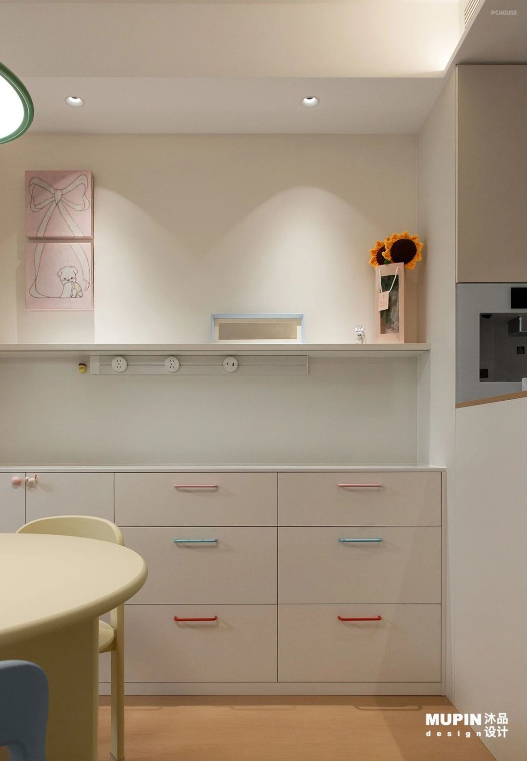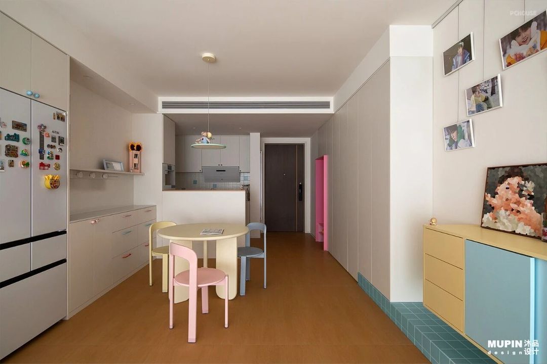 餐厅彩色的椅子、带有彩色把手的柜体等,为空间注入活力,打破了浅色调可能带来的单调感,营造出活泼欢快的氛围。