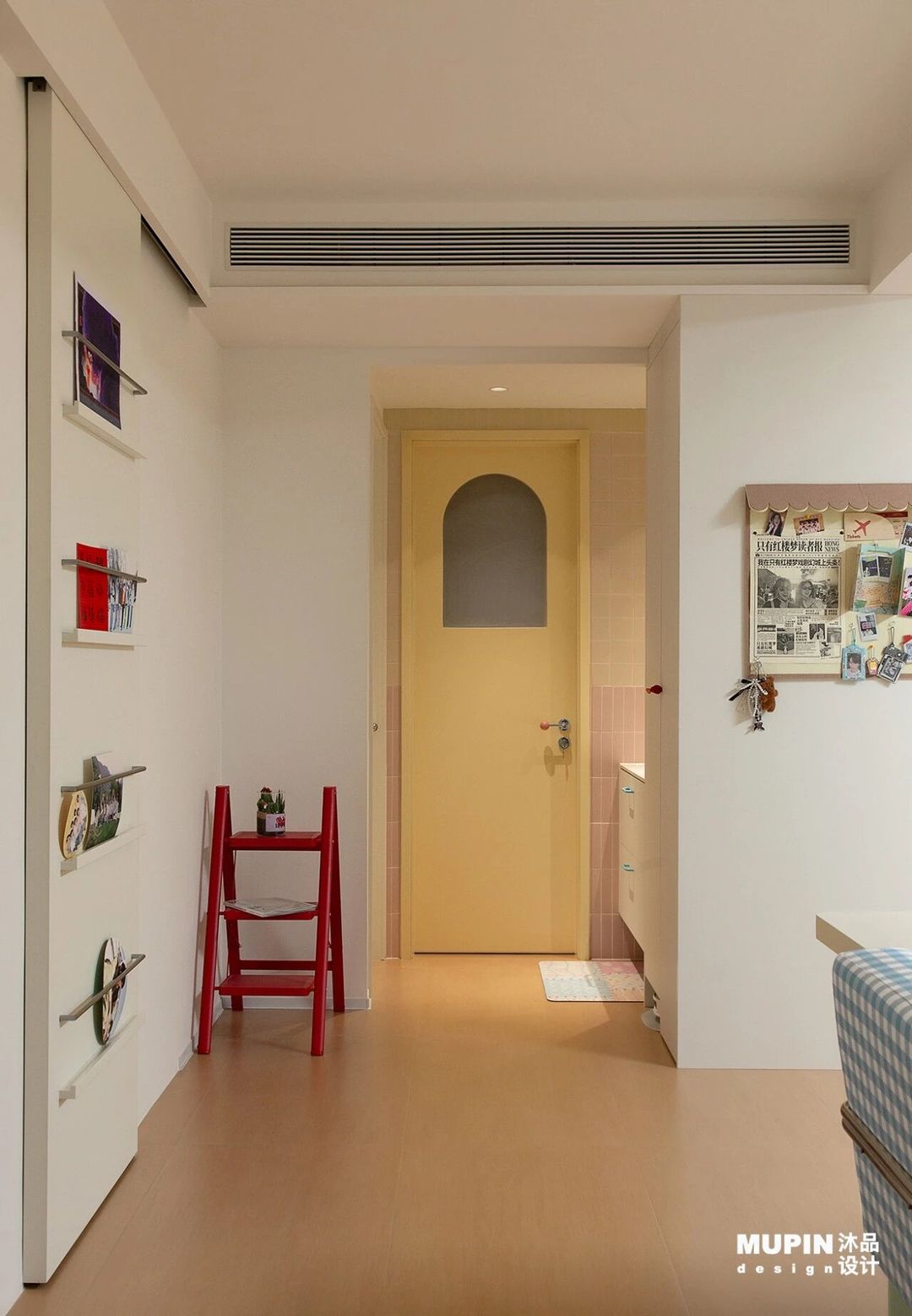 明黄色门造型别致,为空间增添了设计感与趣味性;墙面的照片墙、小梯子上的小摆件等软装,进一步丰富了空间的视觉层次,传递出居住者的生活情趣,让空间更具温度与个性。