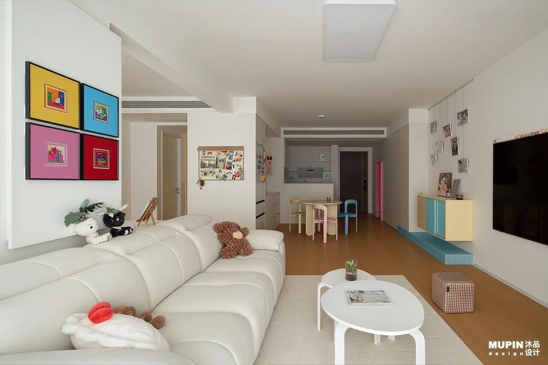 局部点缀彩色元素,为空间注入活力,增添了活泼感,也让空间更具个性与趣味性。客厅布置舒适的白色沙发,满足休闲放松需求。