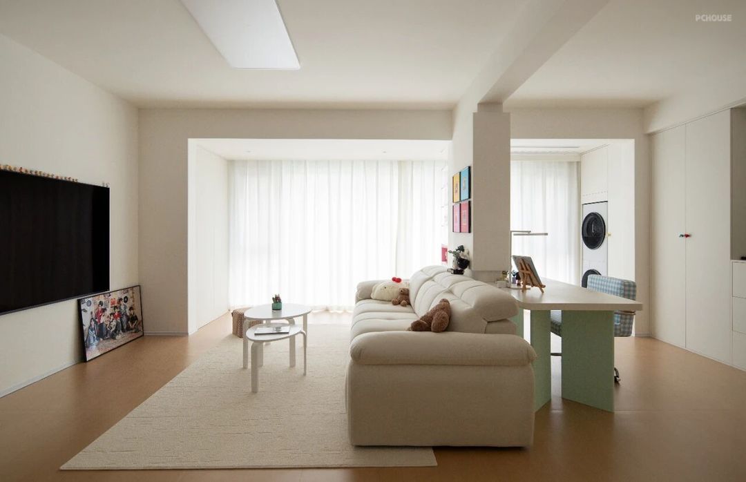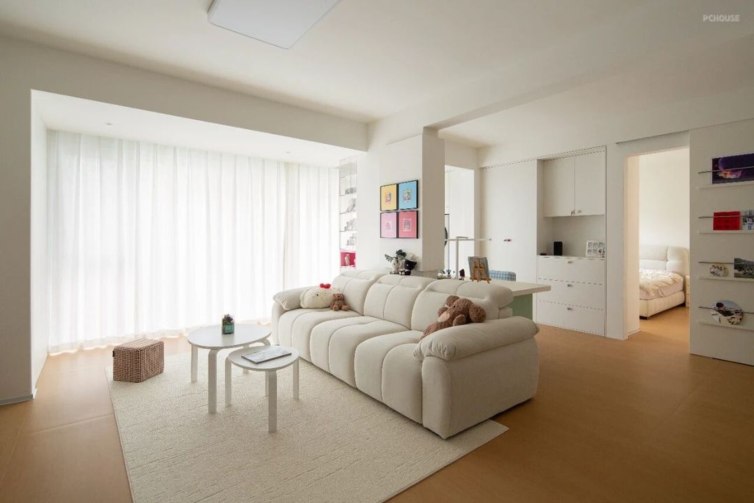 通过打通部分空间,减少了墙体的阻隔,让光线能更顺畅地在区域内流转,结合大面积的白色调运用,进一步放大了空间的明亮感与开阔感,使原本可能局促的空间变得通透舒畅。